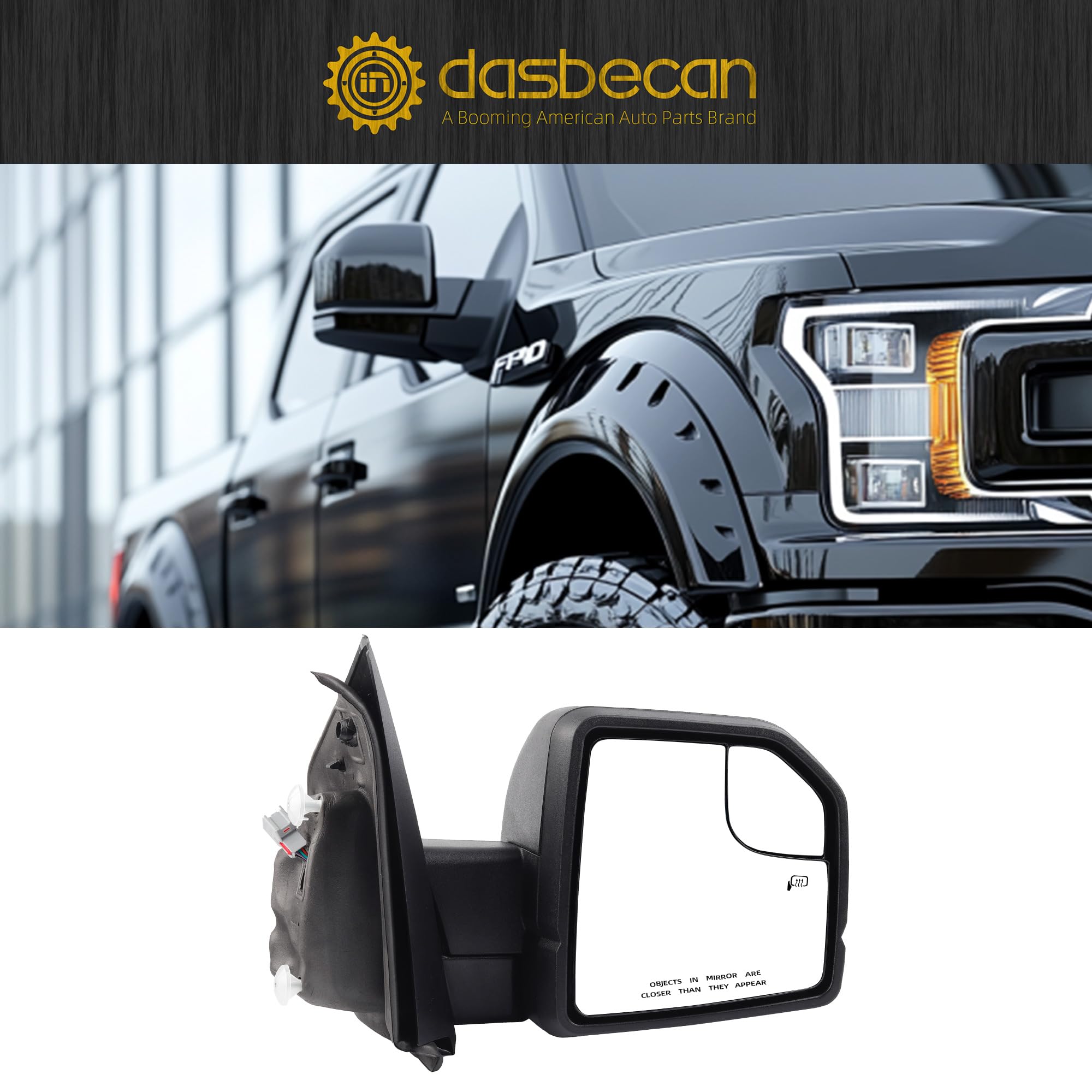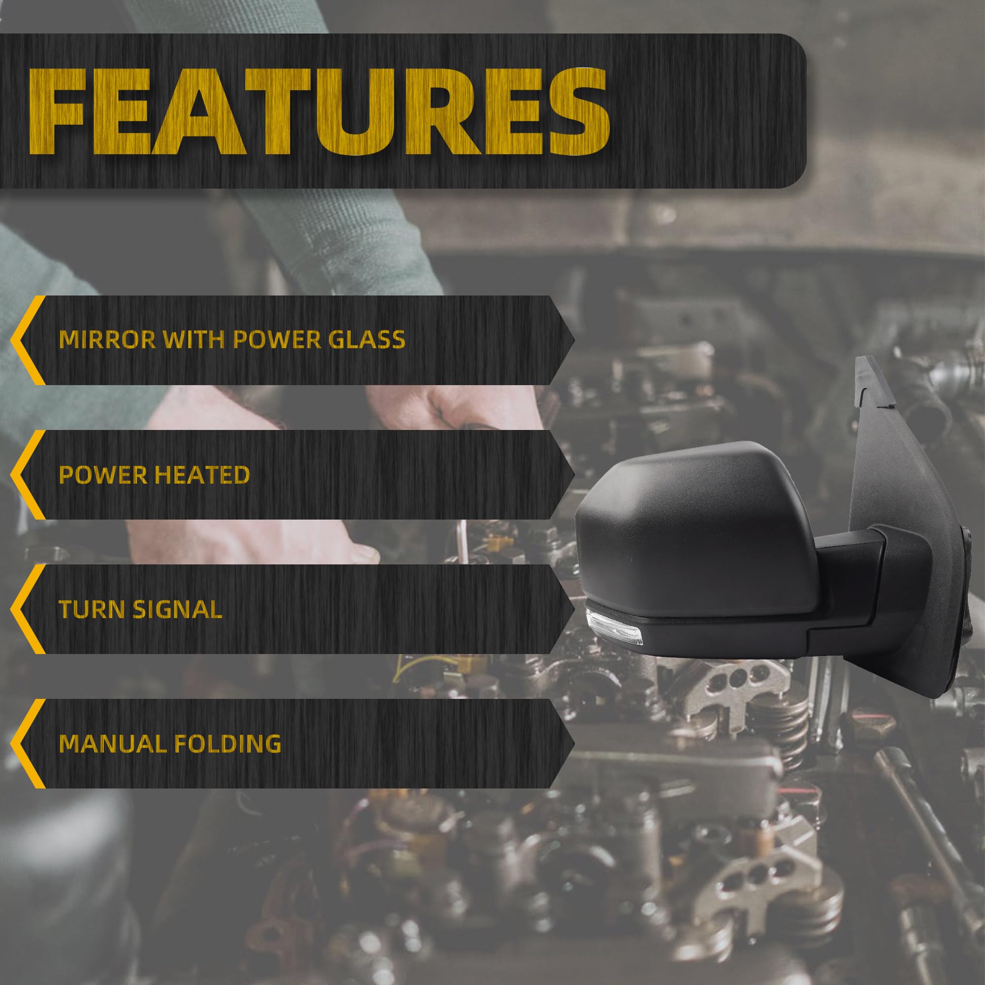 【High-quality Materials】 equipped with Heated, Turn Signal Light, Temperature Sensor, Blind Spot Glass, Power Glass, Manual Folding function. Without electric folding function.Direct replacement ford f150 passenger side mirror, OEM manufacturing standards.