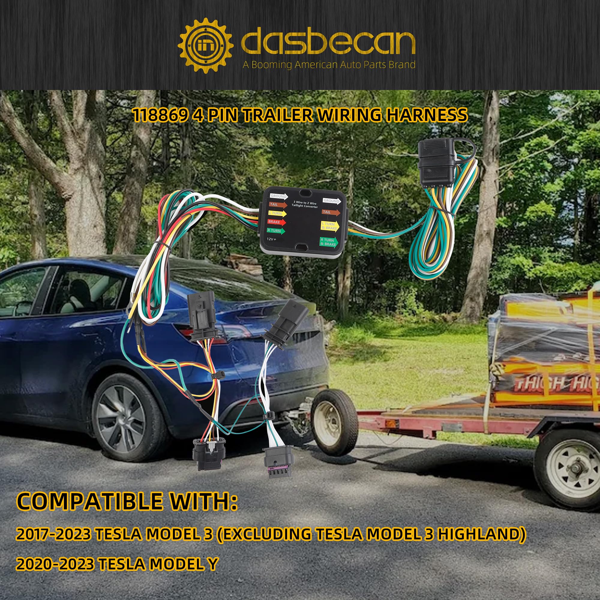 Compatible with: 2017-2023 Tesla Model 3 (Excluding Tesla Model 3 Highland), 2020-2023 Tesla Model Y. This wiring harness has a 5-pin interface and has a brake light function. If you do not need the brake light function, please refer to the compatible vehicle model and select a 4-pin interface wiring harness.