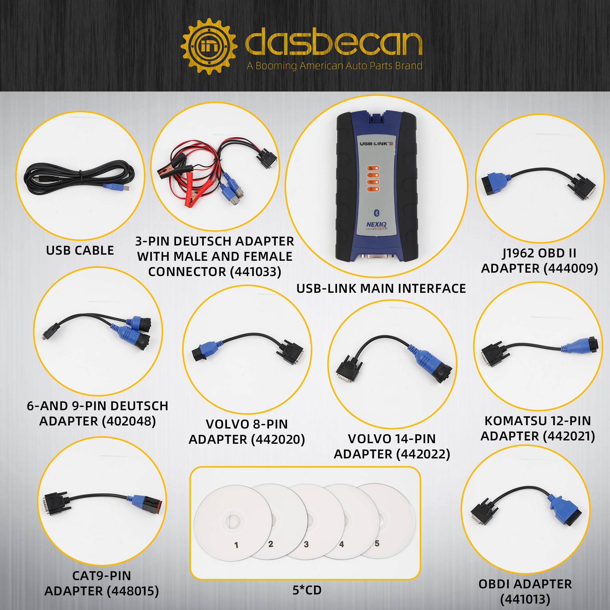 【Package Including】NEXIQ-2 usb-link main interface ; OBD II Adapter(441013) ; J1962 OBD II Adapter(444009) ; 6- and 9-pin Deutsch Adapter(402048 ) ; Volvo 14-Pin Adapter(442022) ; Volvo 8-Pin Adapter(442020) ; Komatsu 12-pin Adapter(442021) ; CAT 9-Pin Adapter(448015) ; 3-pin Deutsch Adapter with male and female connector(441033) ; USB cable ; CD.