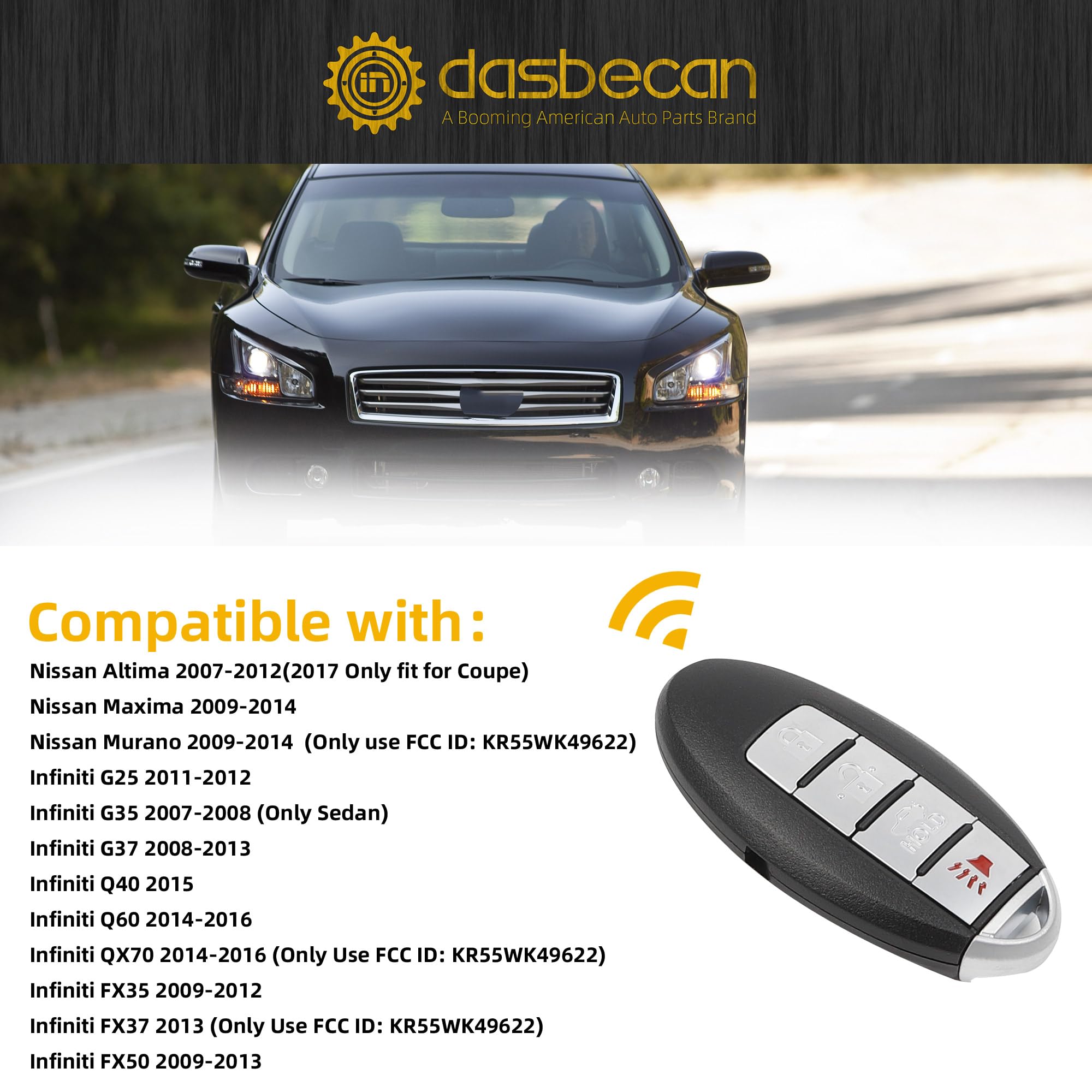 Fitment: This key fob replacement fits for Nissan Altima 2007-2012, Maxima 2009-2014, Murano 2009-2014, Infniti G25 2011-2012, Infniti G35 2007 (Sedan only), Infniti G35 2008, Infniti G37 2008-2013, Infniti FX37 2013 (that use FCC ID:KR55WK49622), Infniti Q60 2014-2016, Ininiti QX70 2014-2015 (that use FCC ID: KR55WK49622)