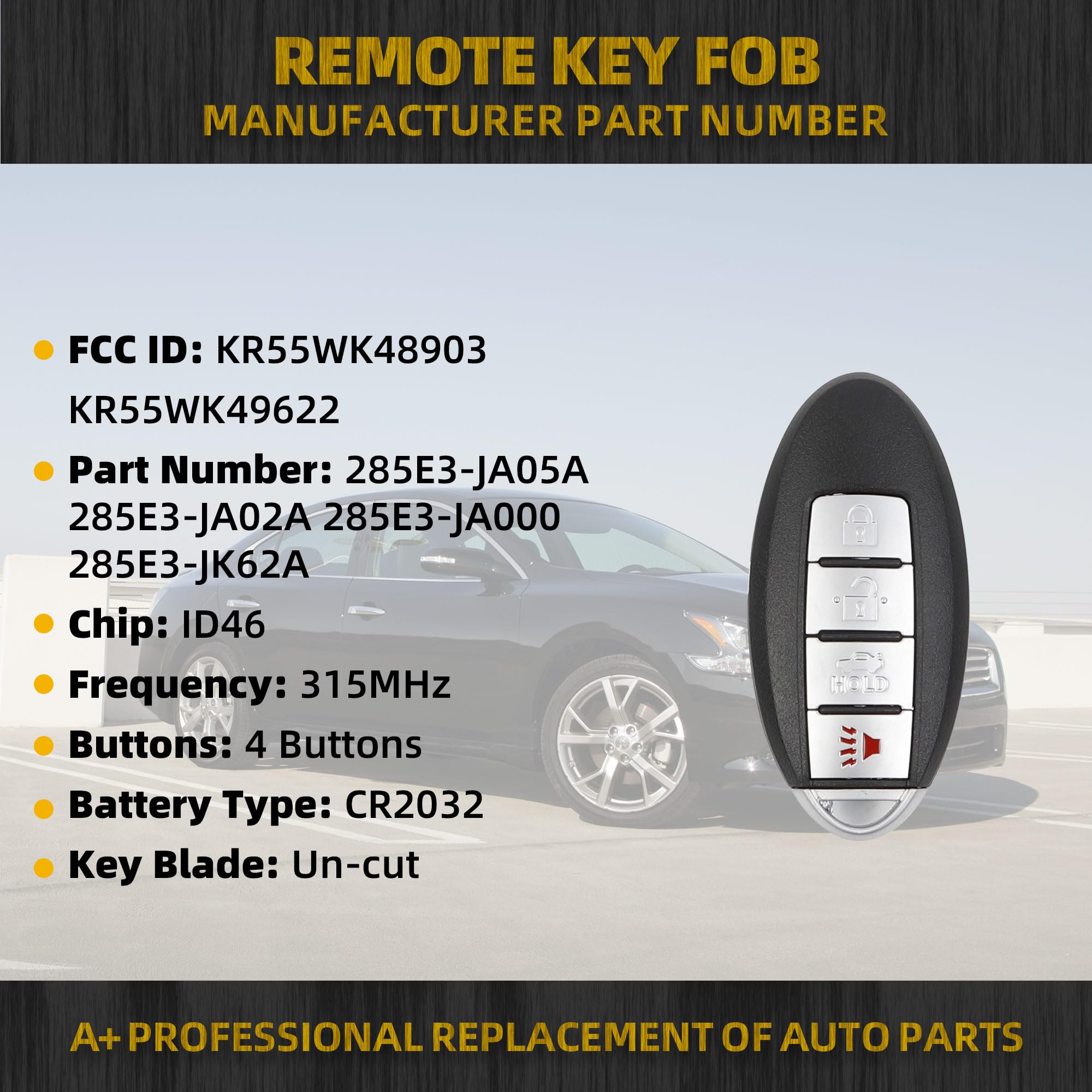 Replaces Part Number: FCC ID KR55WK48903, KR55WK49622, Part Number 285E3-1AA5B, 285E3-1CA5A, 285E3-1CA7A, 285E3-9N07A, 267T-5WK48903, 267T-5WK49622, 285E3-JK65A, Frequency: 315Mhz, Chip: ID46. This keyless entry remote has 4 button functions: Lock, Unlock, Trunk, Panic.