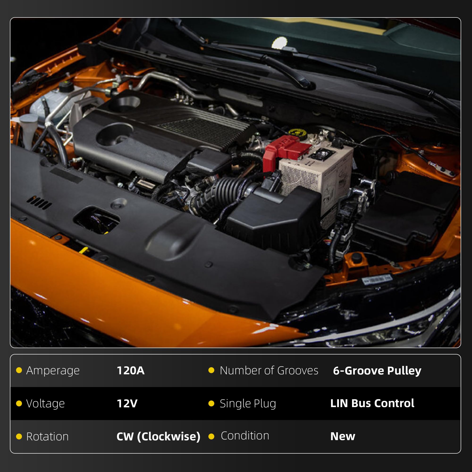 【Technical Parameters】Voltage: 12V ; Amperage: 120Amp ; Rotation: CW ( Clockwise ) ; Number of Groove: 6-Groove Pulley