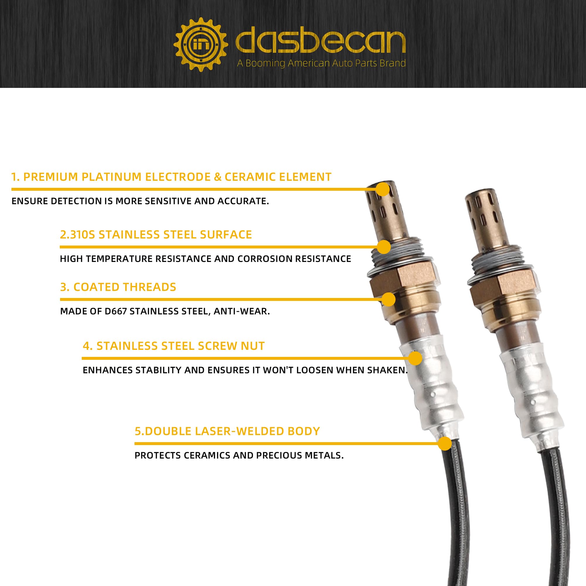 Long lifetime: The oxygen sensor is made of high temperature resistant material with built-in heater, which can accelerate ignition, improve fuel efficiency, reduce harmful emissions, prevent vibration and wire corrosion, and thus prolong service life.