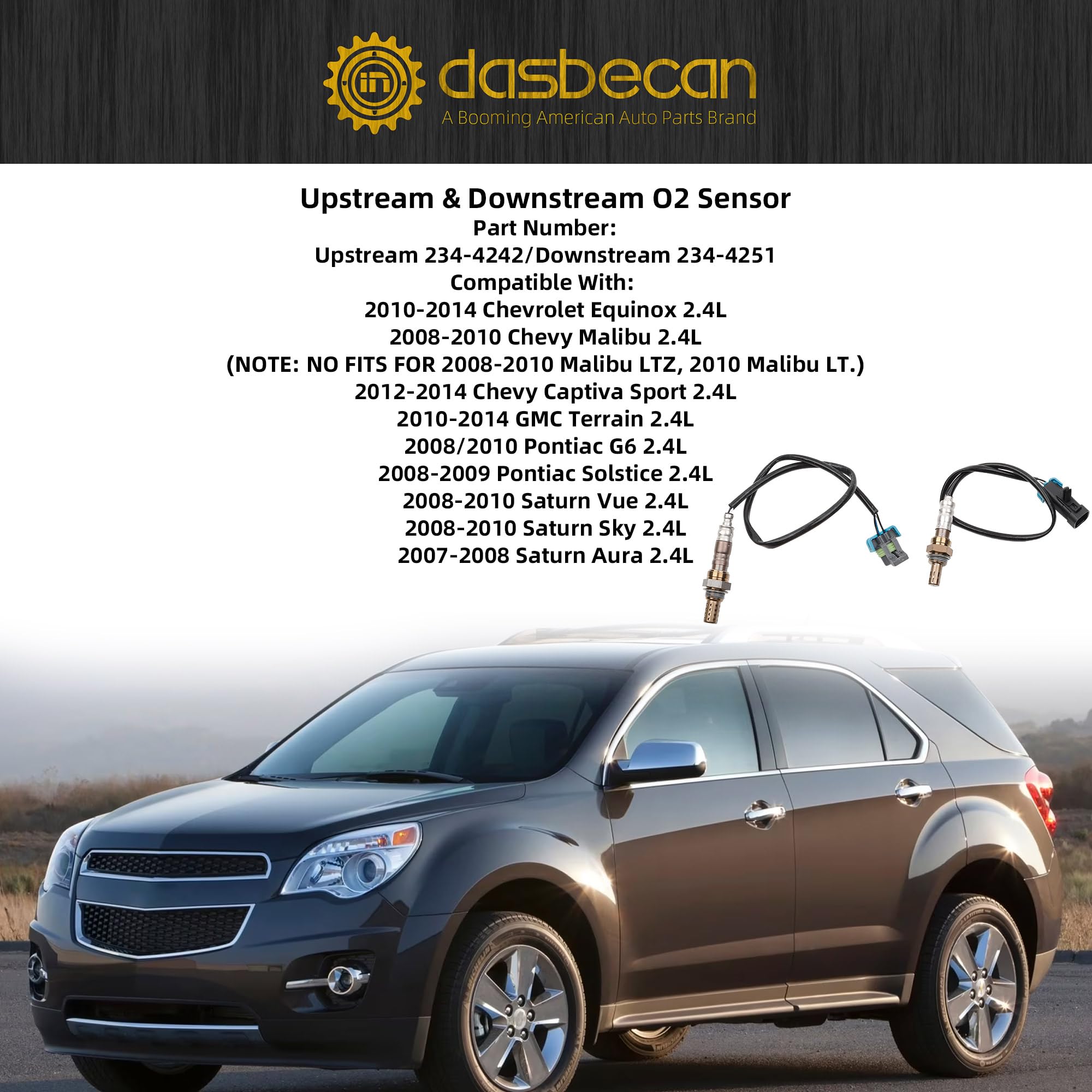 Compatible With: 2010-2014 Chevrolet Equinox 2.4L; 2008-2010 Chevy Malibu 2.4L;2012-2014 Chevy Captiva Sport 2.4L; 2010-2014 GMC Terrain 2.4L; 2008/2010 Pontiac G6 2.4L; 2008-2009 Pontiac Solstice 2.4L; 2008-2010 Saturn Vue 2.4L; 2008-2010 Saturn Sky 2.4L; 2007-2008 Saturn Aura 2.4L (NOTE: NO FITS FOR 2008-2010 Malibu LTZ, 2010 Malibu LT.)