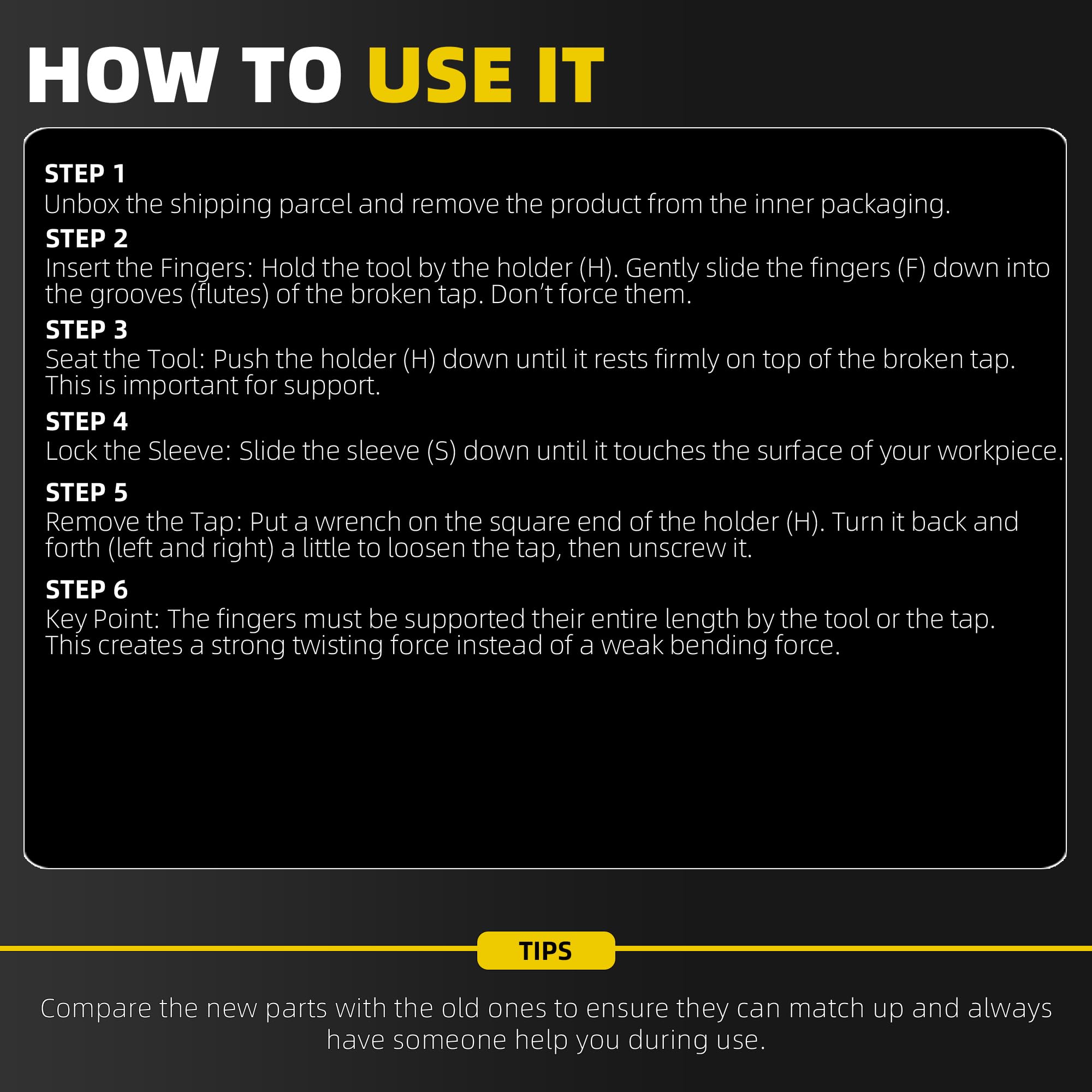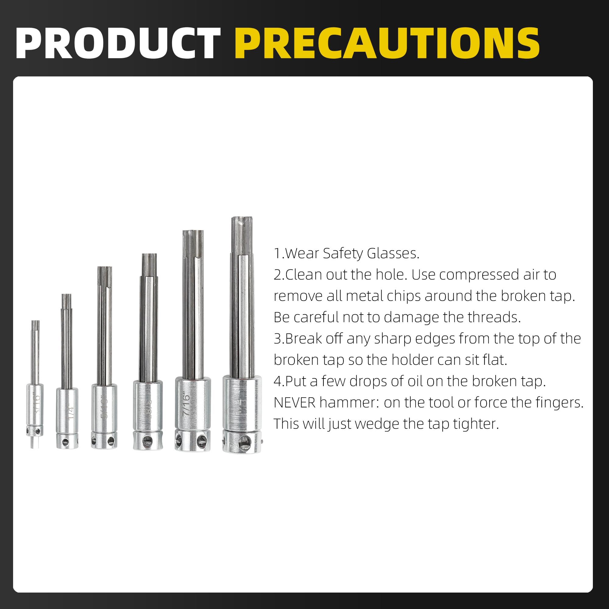【Comptiable With】This tap extractor features sizes ranging from 3/16 inch to 1/2 inch(1/2'' 7/16'' 3/8'' 5/16'' 1/4'' 3/16''), a four-slot design, and replaceable spiral slots.