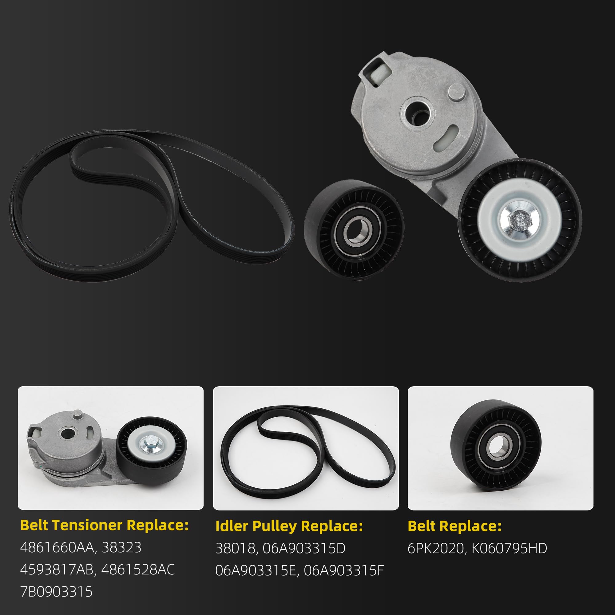 【Replace】 Belt Tensioner : 4861660AA,38323,4593817AB,4861528AC,7B0903315 ; Idler Pulley: 38018,06A903315D,06A903315E,06A903315F ; Belt: 6PK2020 K060795HD