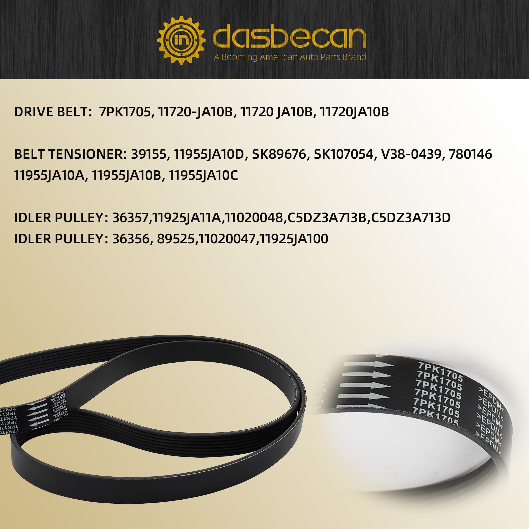 【Replace】Drive Belt Tensioner: 39155, 11955JA10D, SK89676, SK107054, V38-0439, 780146 11955JA10A, 11955JA10B, 11955JA10C ;Drive Belt: 7PK1705, 11720-JA10B, 11720 JA10B, 11720JA10B ; Idler Pulley 1: 36357,11925JA11A,11020048,C5DZ3A713B,C5DZ3A713D; Idler Pulley 2: 36356, 89525,11020047,11925JA100