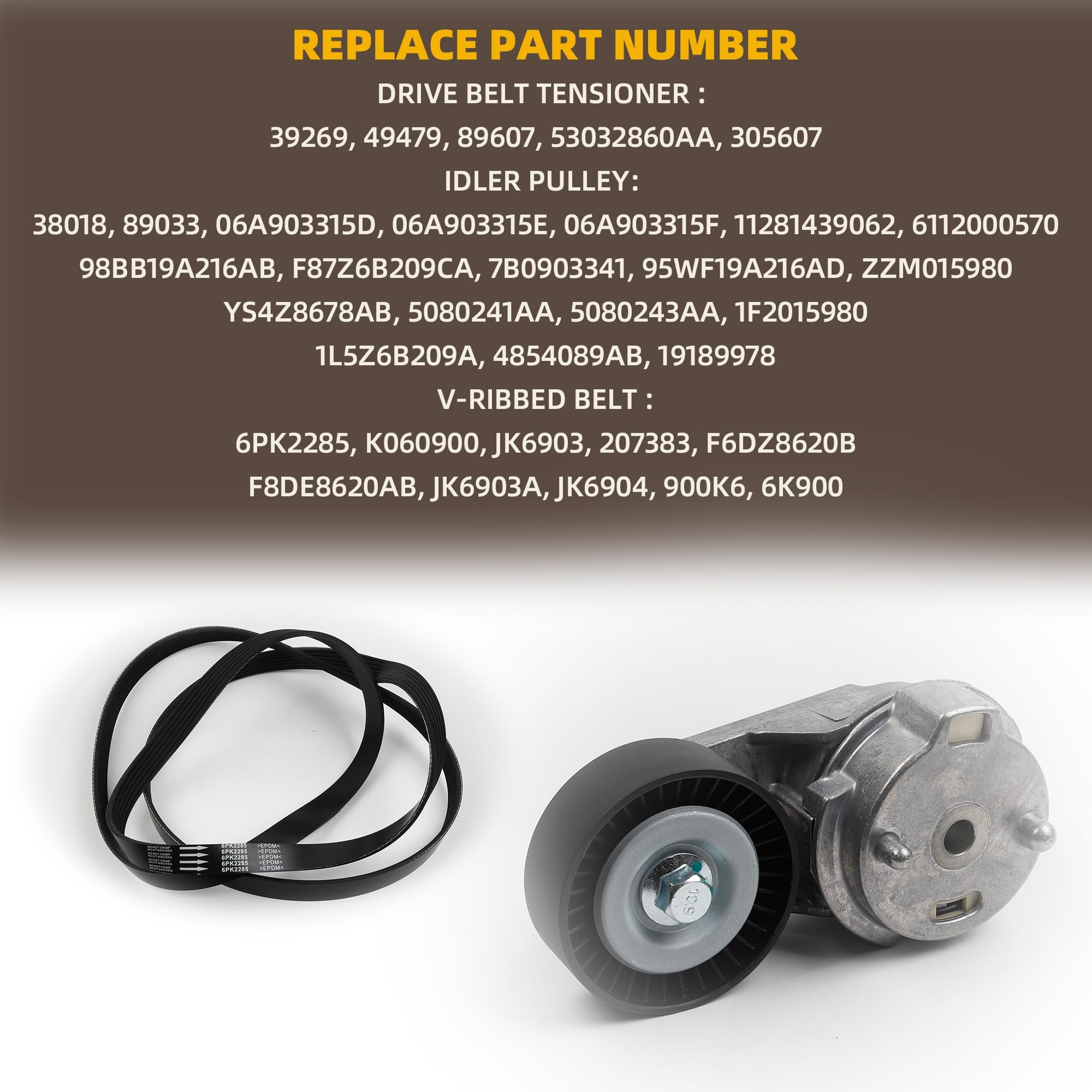 【OE Part Number】 1* Drive Belt Tensioner: 39269, 49479, 89607, 53032860AA, 305607; 1* Idler Pulley: 38018, 89033, 06A903315D, 06A903315E, 06A903315F, 11281439062, 6112000570, 98BB19A216AB, F87Z6B209CA, 7B0903341, 95WF19A216AD, ZZM015980, YS4Z8678AB, 5080241AA, 5080243AA, 1F2015980, 1L5Z6B209A, 4854089AB, 19189978; 1 * V-Ribbed Belt: 6PK2285, K060900, JK6903, 207383, F6DZ8620B, F8DE8620AB, JK6903A, JK6904, 900K6, 6K900.