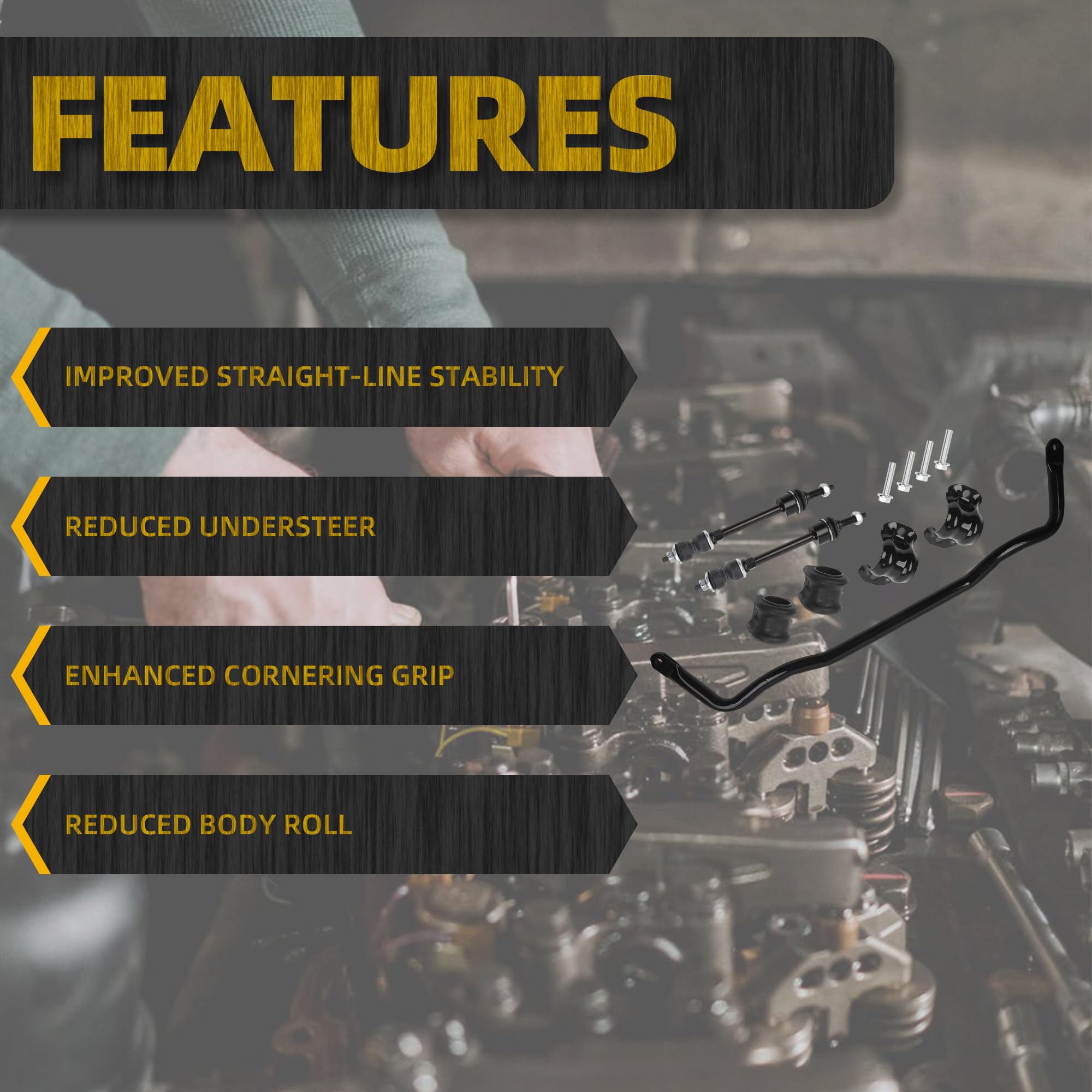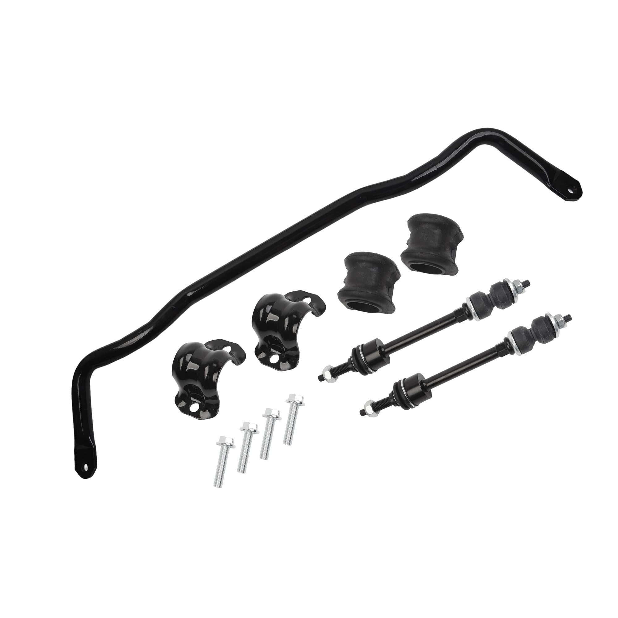 Package list: Front Stabilizer Bar x1pc, bushings x2pcs, Bushing Retainer x2pcs, Hex Head Screw x4pcs, Sway Bar End links x2pcs.