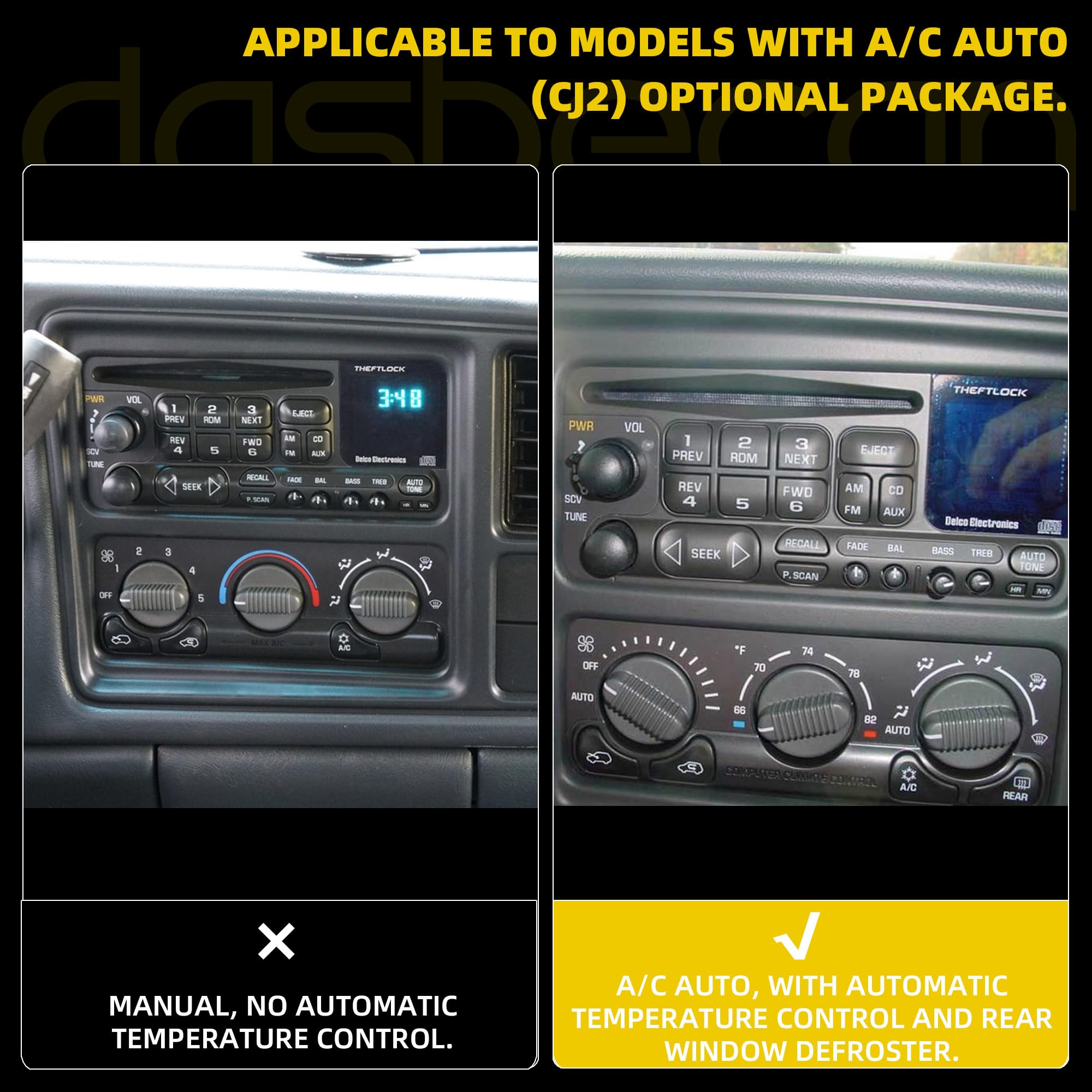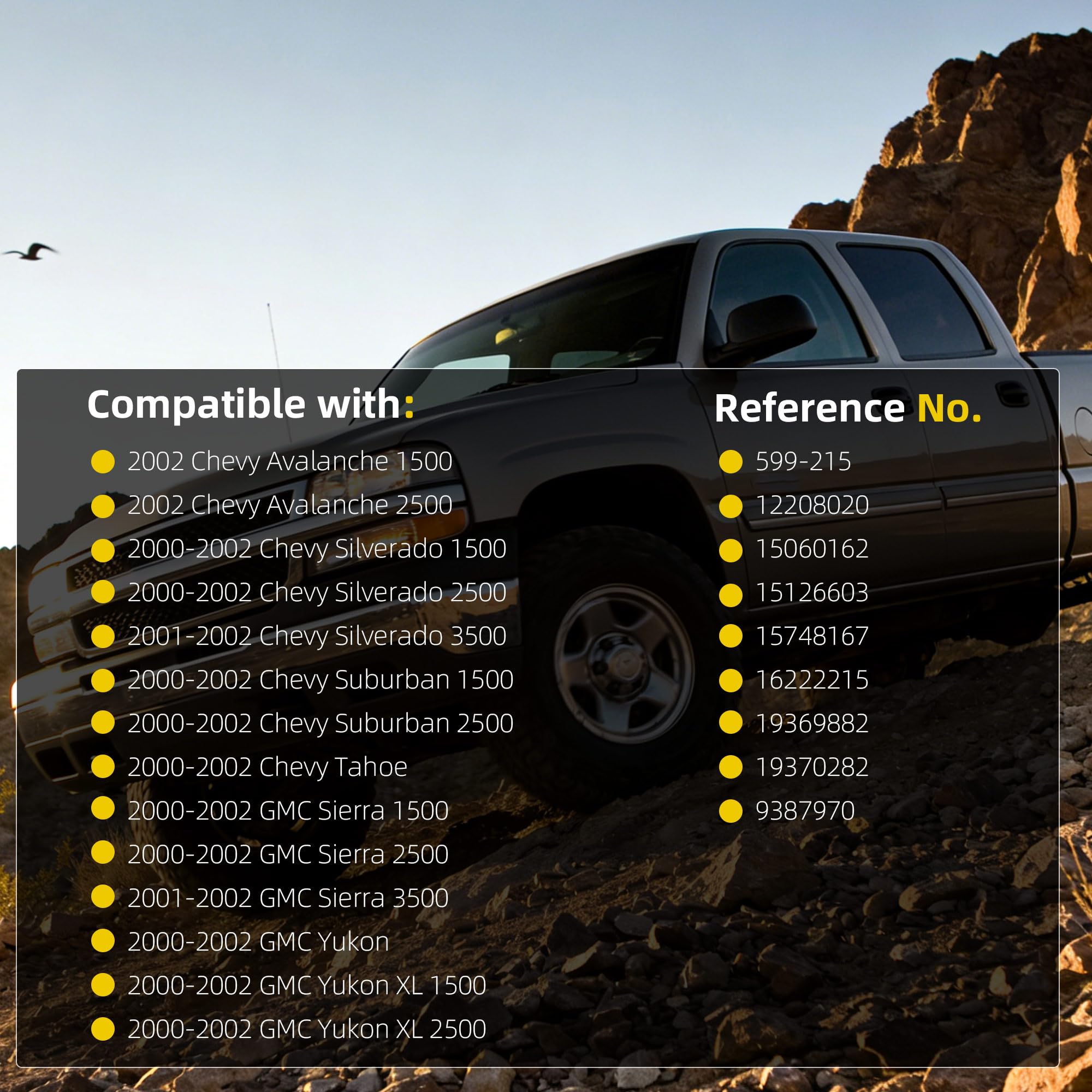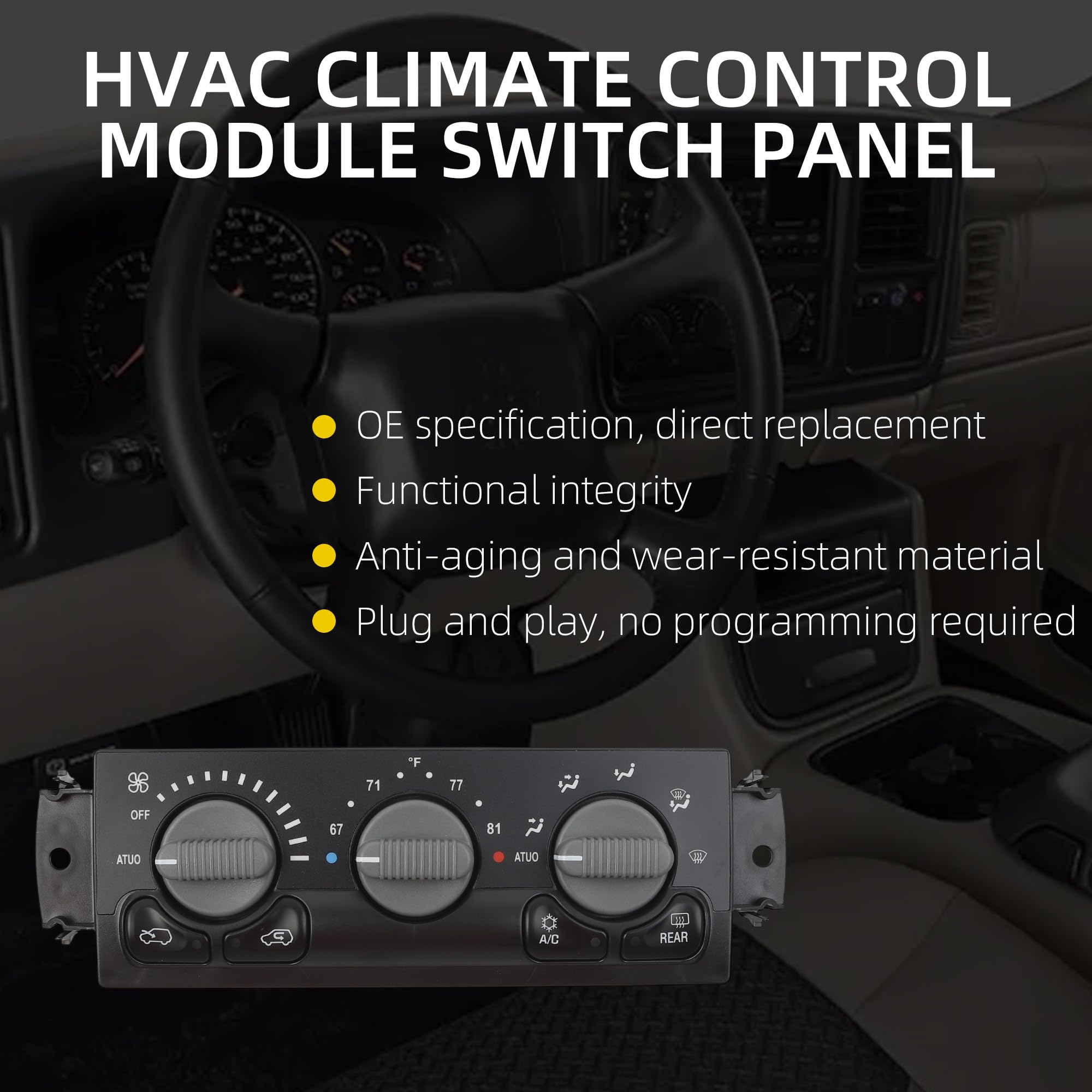 【Compatible with】This ac control is compatible with the 2002 Chevy Avalanche 1500 2002 Chevy Avalanche 2500 2000-2002 Chevy Silverado 1500 2000-2002 Chevy Silverado 2500 2001-2002 Chevy Silverado 3500 2000-2002 Chevy Suburban 1500 2000-2002 Chevy Suburban 2500 2000-2002 Chevy Tahoe 2000-2002 GMC Sierra 1500 2000-2002 GMC Sierra 2500 2001-2002 GMC Sierra 3500 2000-2002 GMC Yukon 2000-2002 GMC Yukon XL 1500 2000-2002 GMC Yukon XL 2500