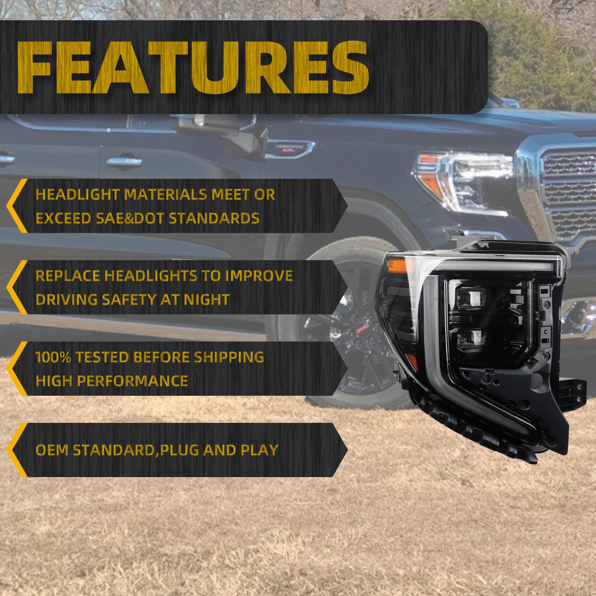 【Features】GMC Sierra 1500 Headlamps is OEM Standard ,Made of high quality materials, Waterproof, dustproof, anti-fog.With bulb and wiring harness ,direct installation.