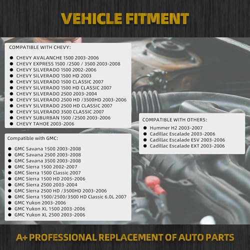 【Compatible With Chevy】The belt tensioner kit fits for Chevy Avalanche 1500 2003-2006 ; Chevy Express 1500 / 2500 / 3500 2003-2008 ; Chevy Silverado 1500 2002-2006 ; Chevy Silverado 1500 HD 2003; Chevy Silverado 1500 Classic /1500 HD Classic 2007 ; Chevy Silverado 2500 2003-2004 ; Chevy Silverado 2500 HD /3500HD 2003-2006 ; Chevy Silverado 2500 HD Classic 2007 ; Chevy Silverado 3500 Classic 2007 ; Chevy Suburban 1500 /2500 2003-2006; Chevy Tahoe 2003-2006