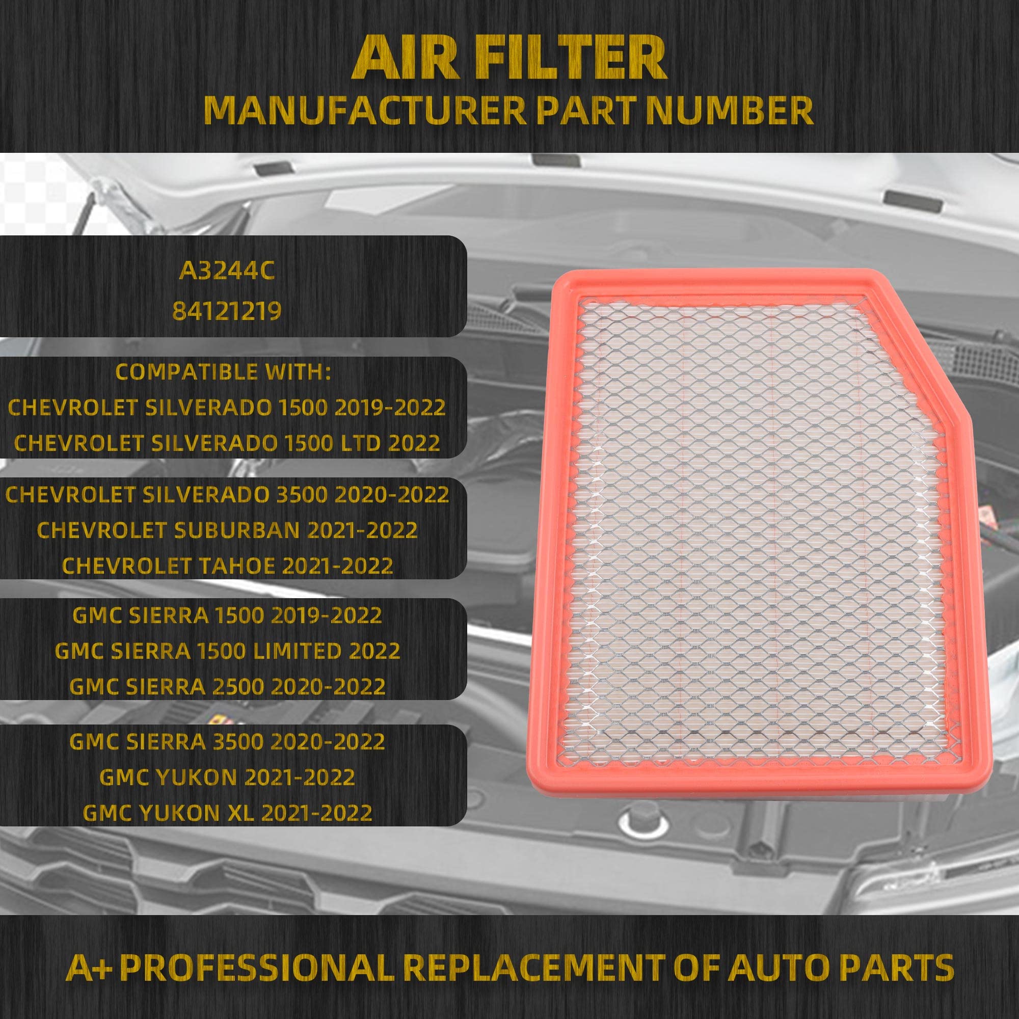 Fit for: GMC Sierra 1500 2019-2022/GMC Sierra 1500 LIMITED 2022/GMC Sierra 2500 2020-2022(Not fit for 6.6L Duramax V8 DIESEL Turbocharged)/GMC Sierra 3500 2020-2022(Not fit for 6.6L Duramax V8 DIESEL Turbocharged)/GMC Yukon 2021-2022/ GMC Yukon XL 2021-2022/ Cadillac Escalade 2021-2022/ Cadillac Escalade ESV 2021-2022