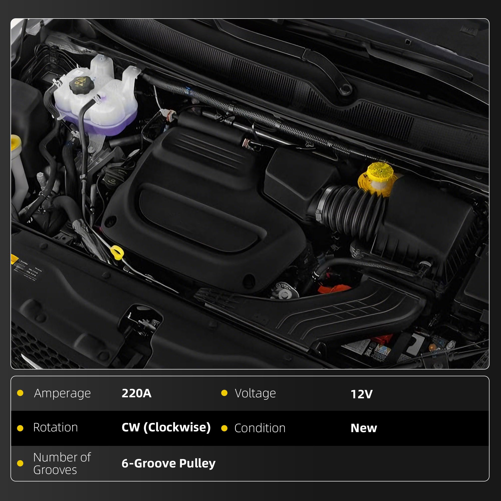 【Technical Parameters】 Voltage: 12V ; Amperage: 220Amp ; Rotation: CW ( Clockwise ) ; Number of Groove: 6-Groove Pulley