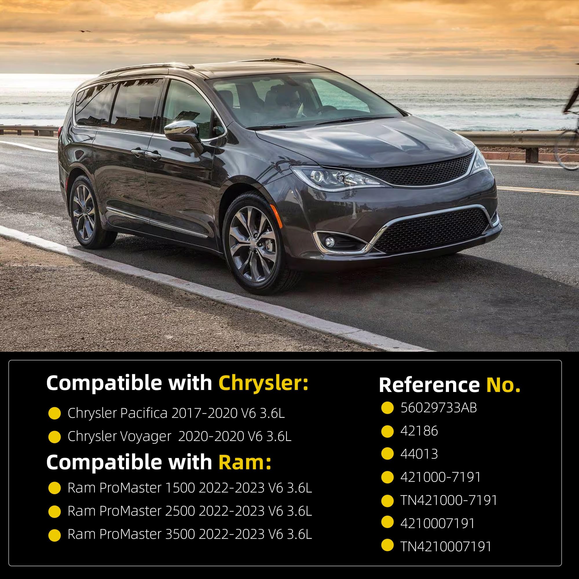 【Fitment】Our High Output Alternator Fits for Chrysler Pacifica 2017-2020 V6 3.6L , Voyager 2020-2020 V6 3.6L ; Ram ProMaster 1500 2022-2023 V6 3.6L , Ram ProMaster 2500 2022-2023 V6 3.6L , Ram ProMaster 3500 2022-2023 V6 3.6L