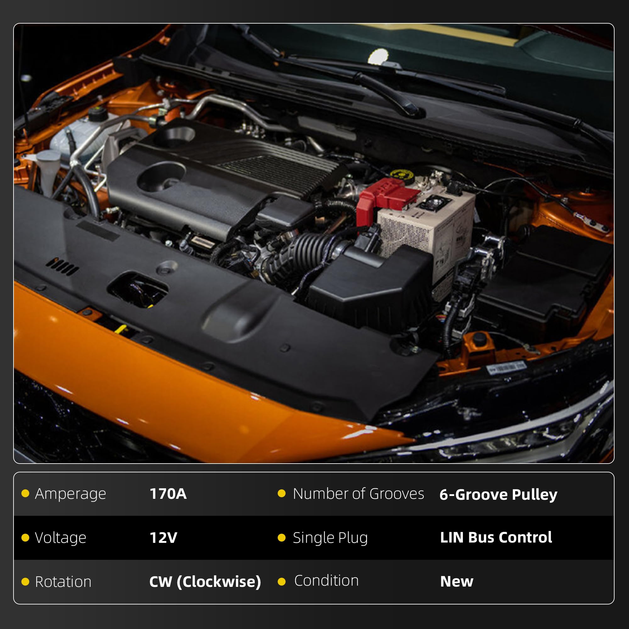 【Technical Parameters】Voltage: 12V ; Amperage: 170Amp ; Rotation: CW ( Clockwise ) ; Number of Groove: 6-Groove Pulley