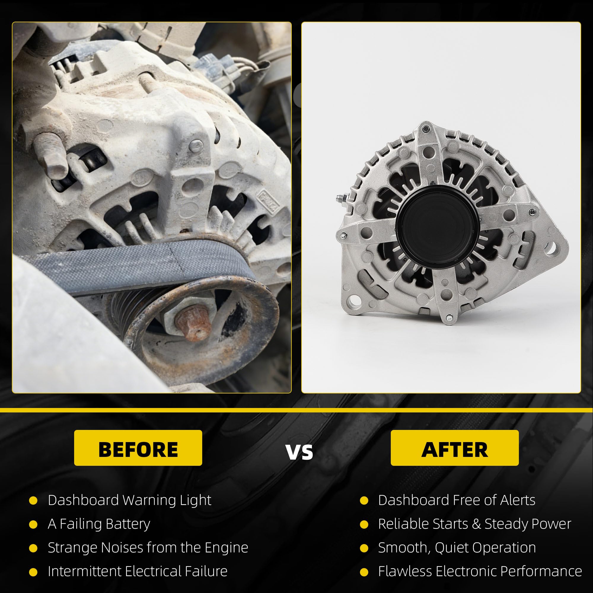 【Features】Crafted with quality-tested materials, this alternator reliably powers your vehicle’s electrical systems. Designed for quiet operation with reduced noise, it delivers consistent power under various driving conditions and weather. Consider replacement if your vehicle experiences hard starts, weak electrical performance, increased fuel consumption, irregular charging, or unusual noises. During normal operation, it produces no noticeable smoke or odor