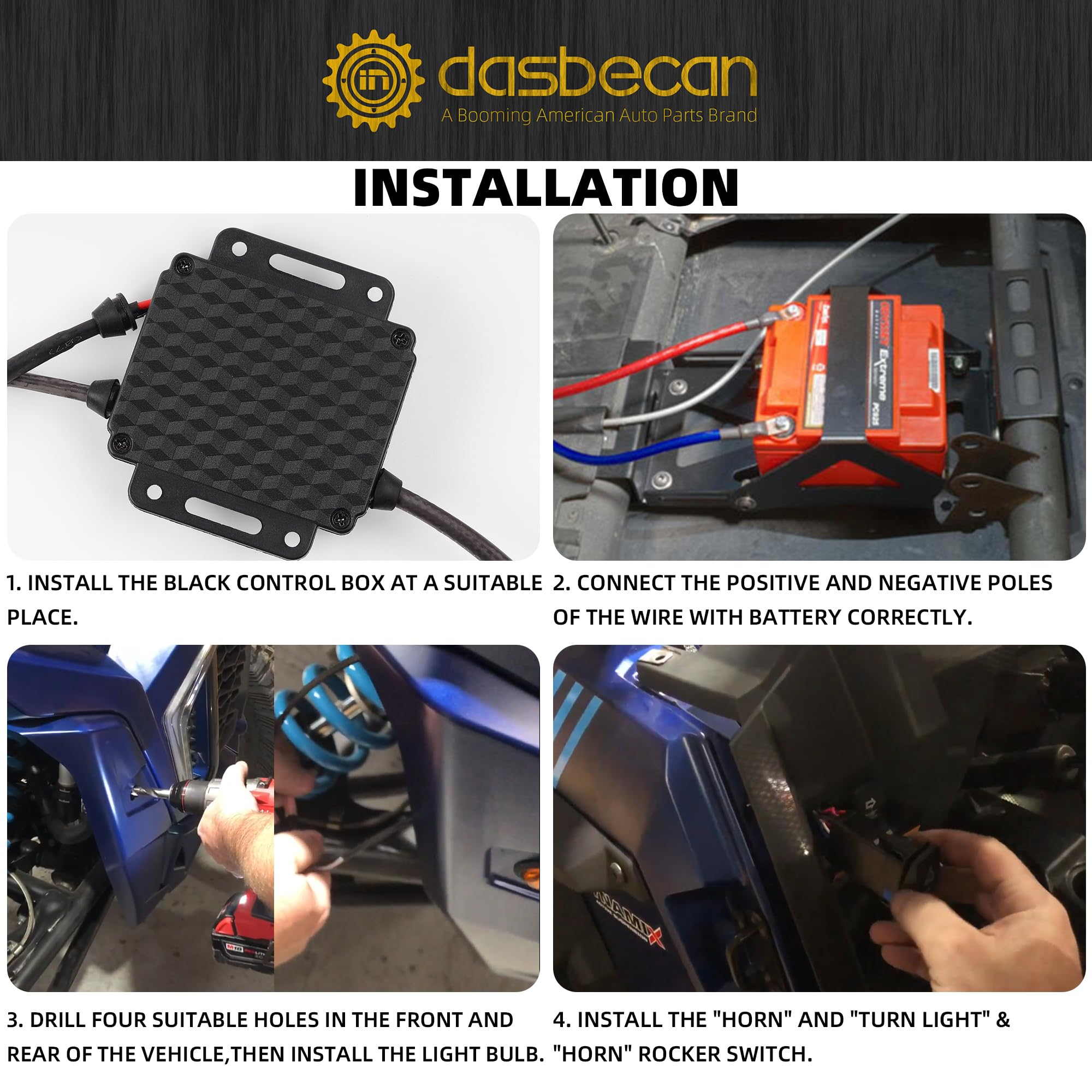Compatible model: Universal UTV turn signals kit with horn is suitable for Polaris, Kawasaki, Can-Am, Yamaha, Arctic Cat, Bobcat, Case IH, Cub Cadet, Honda, Husqvarna, John Deere, Kubota.