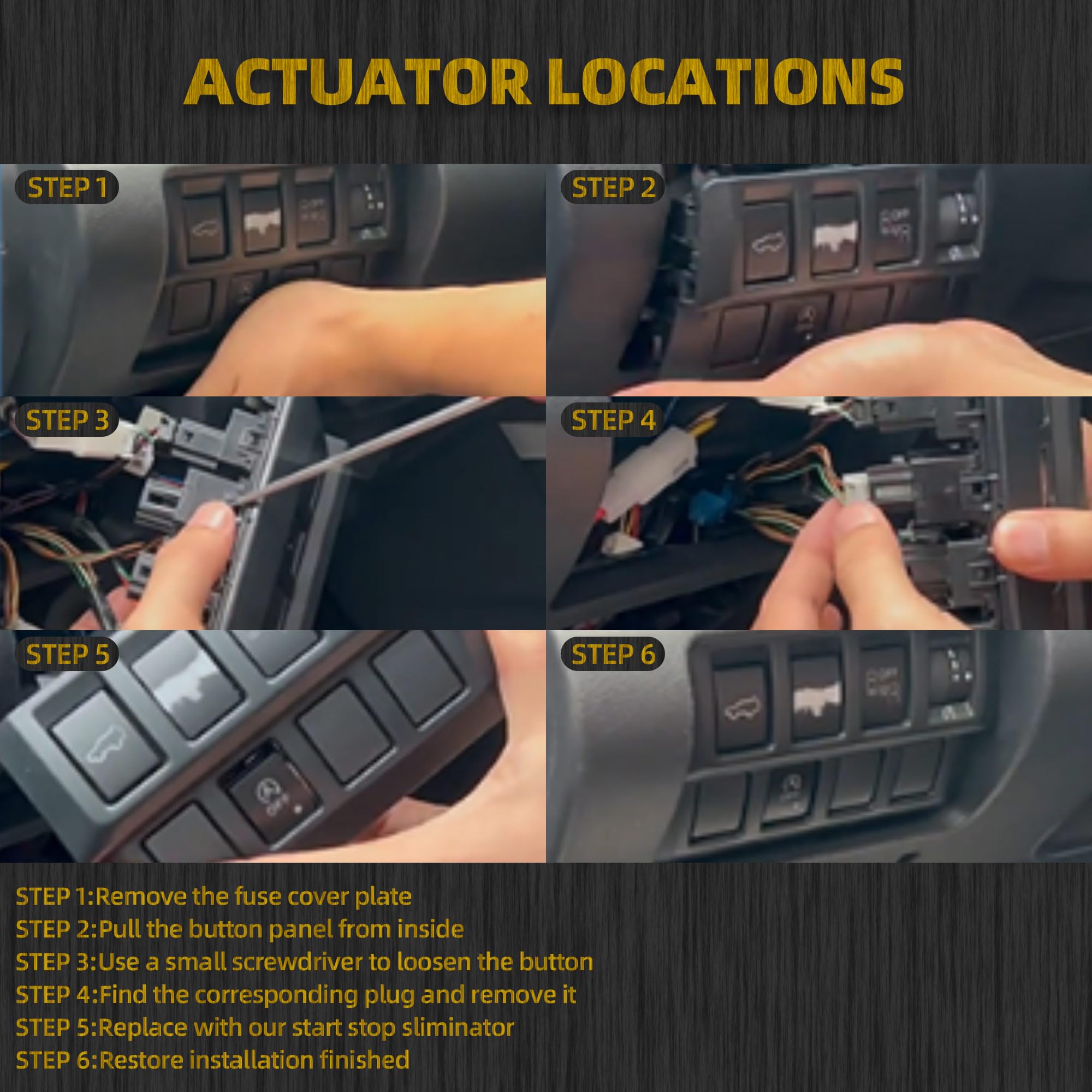 【Easy Installation】Remove the fuse cover and locate the plug corresponding to the auto start-stop button. Disconnect the plug, remove the original auto start-stop button, replace it with our new auto start-stop eliminator button, reinstall the plug.