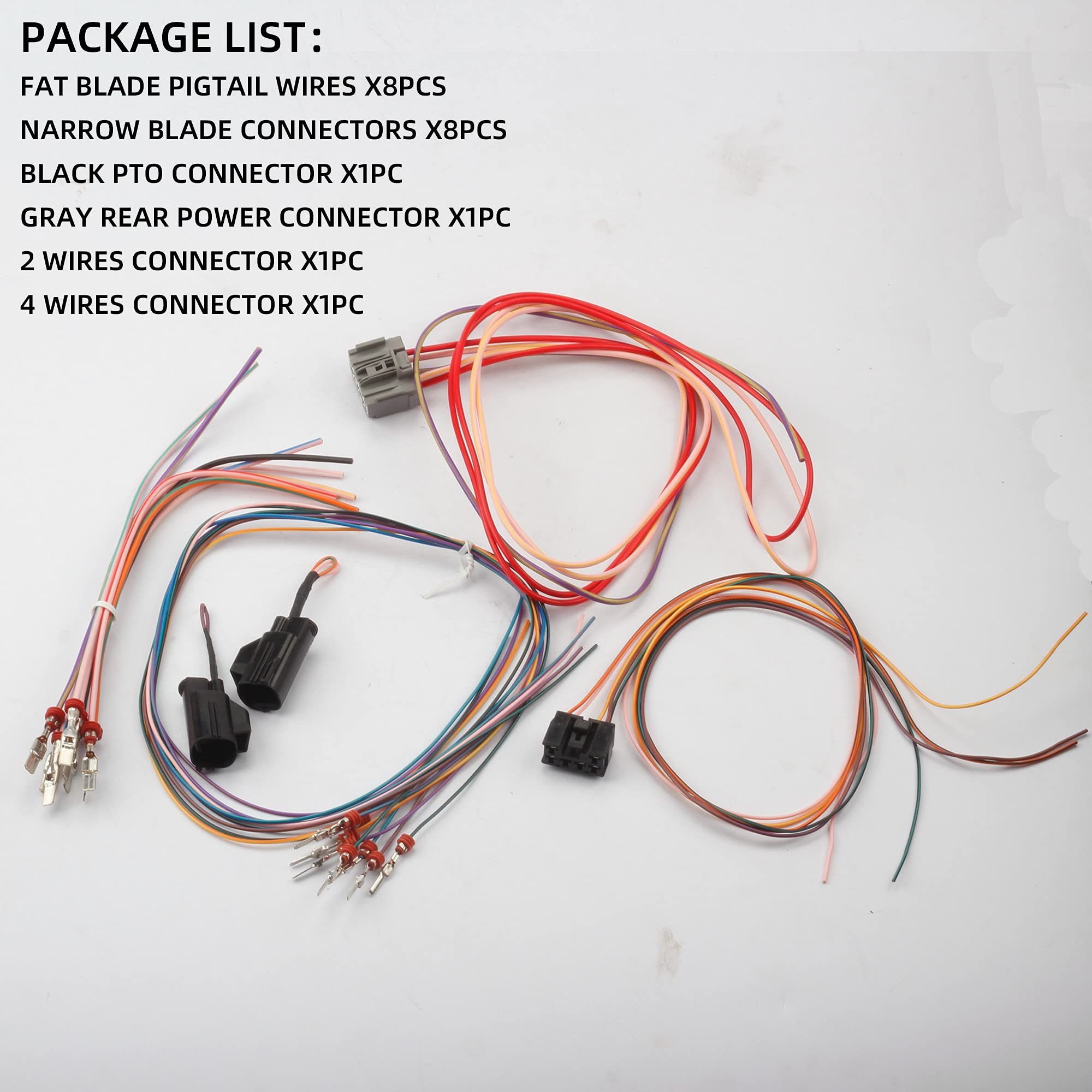 【Package List】fat blade pigtail wires x8pcs, narrow blade connectors x8pcs, black PTO connector x1pc, gray rear power connector x1pc, 2 wires connector x1pc, 4 wires connector x1pc