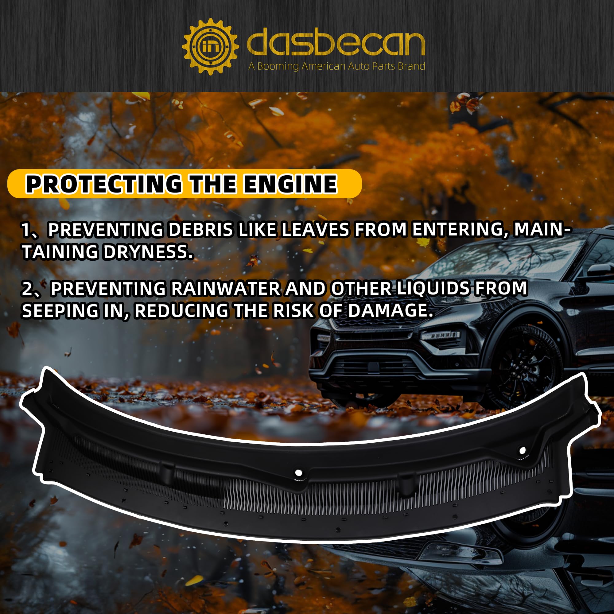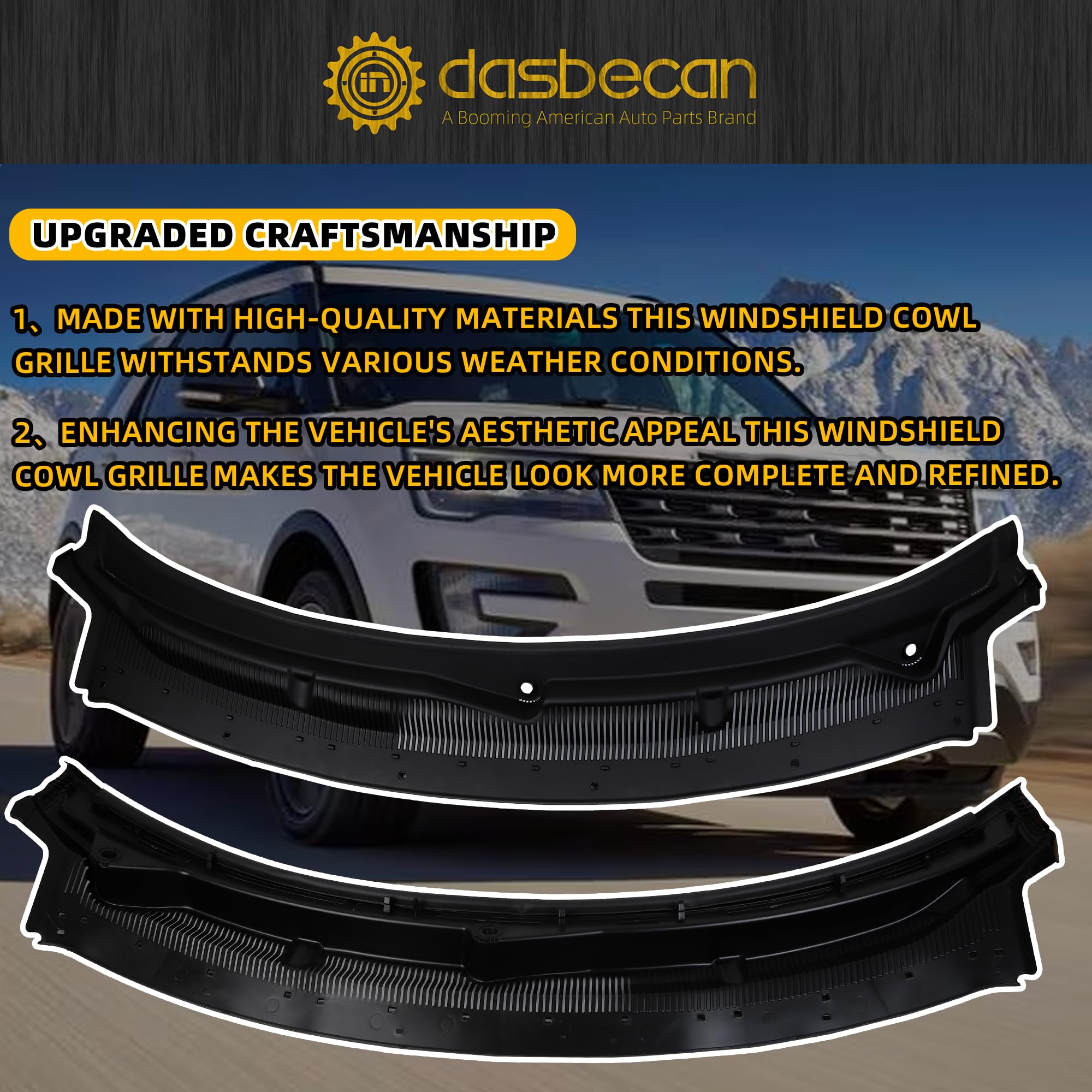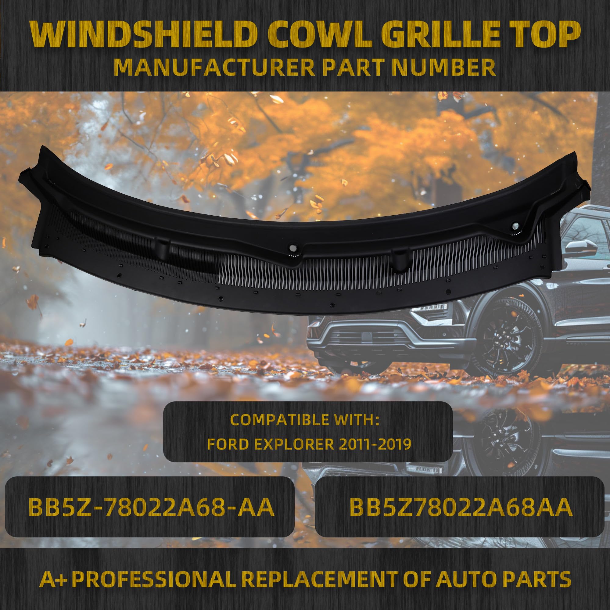 Fit for Ford Explorer : The Windshield Cowl Grille Replaces# BB5Z-78022A68-AA BB5Z78022A68AA, and specifically customized for the Ford Explorer 2011-2019