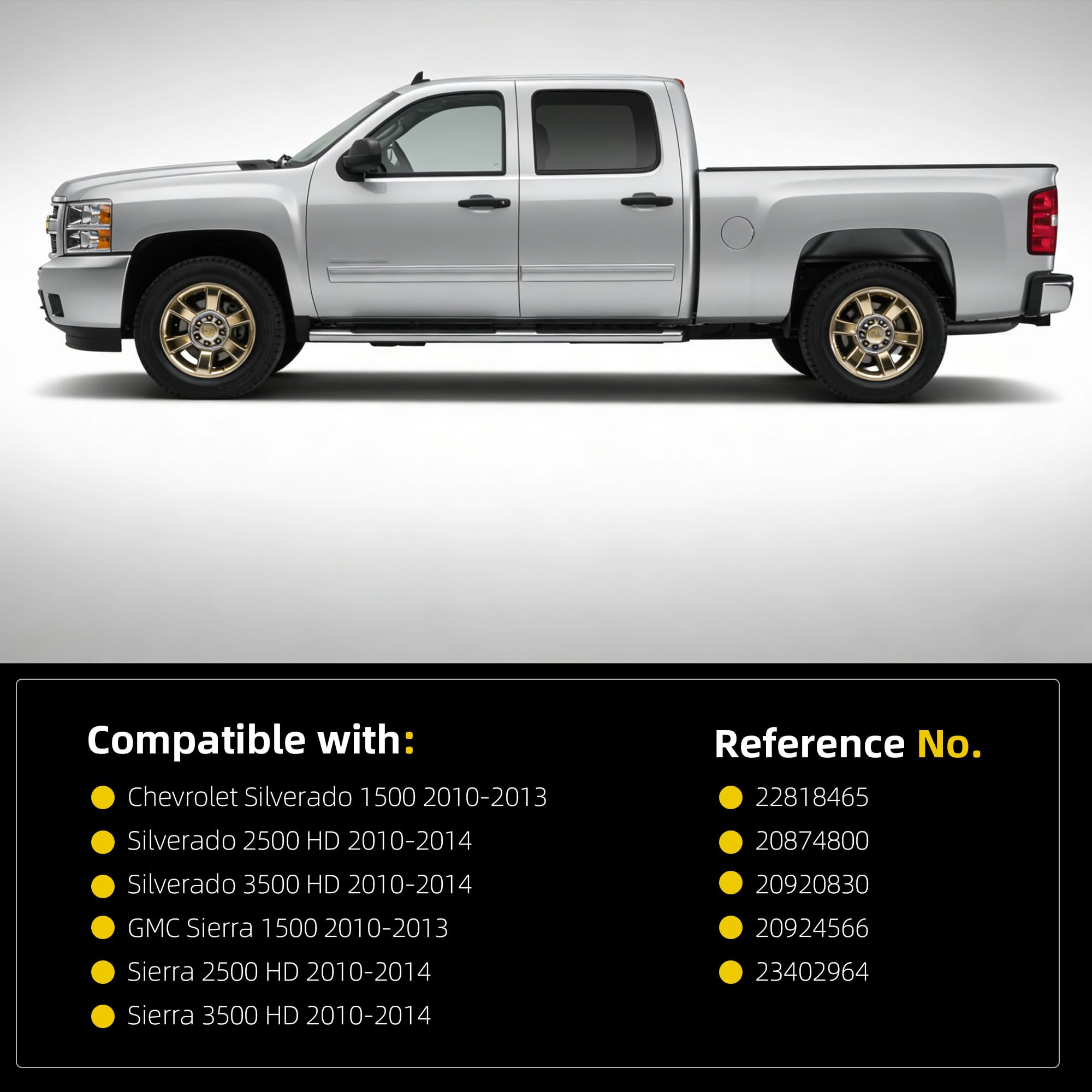 【Comptiable With】 Chevrolet Silverado 1500 2010-2013, Silverado 2500 HD 2010-2014, Silverado 3500 HD 2010-2014, GMC Sierra 1500 2010-2013, Sierra 2500 HD 2010-2014, Sierra 3500 HD 2010-2014;