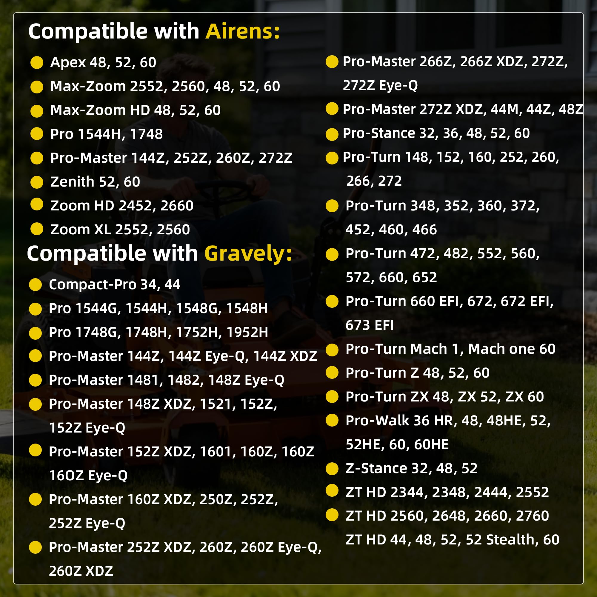 【Wide Compatibility】 Deck spindle assembly compatible with Ariens and Gravely mowers, including Apex, Zoom, Max Zoom, Pro-Master, Zenith, Z-Stance, Pro-Stance, and ZT HD models. Replaces OEM part numbers 59202600, 59215400, 59225700, 69207500, 69219700, and more.