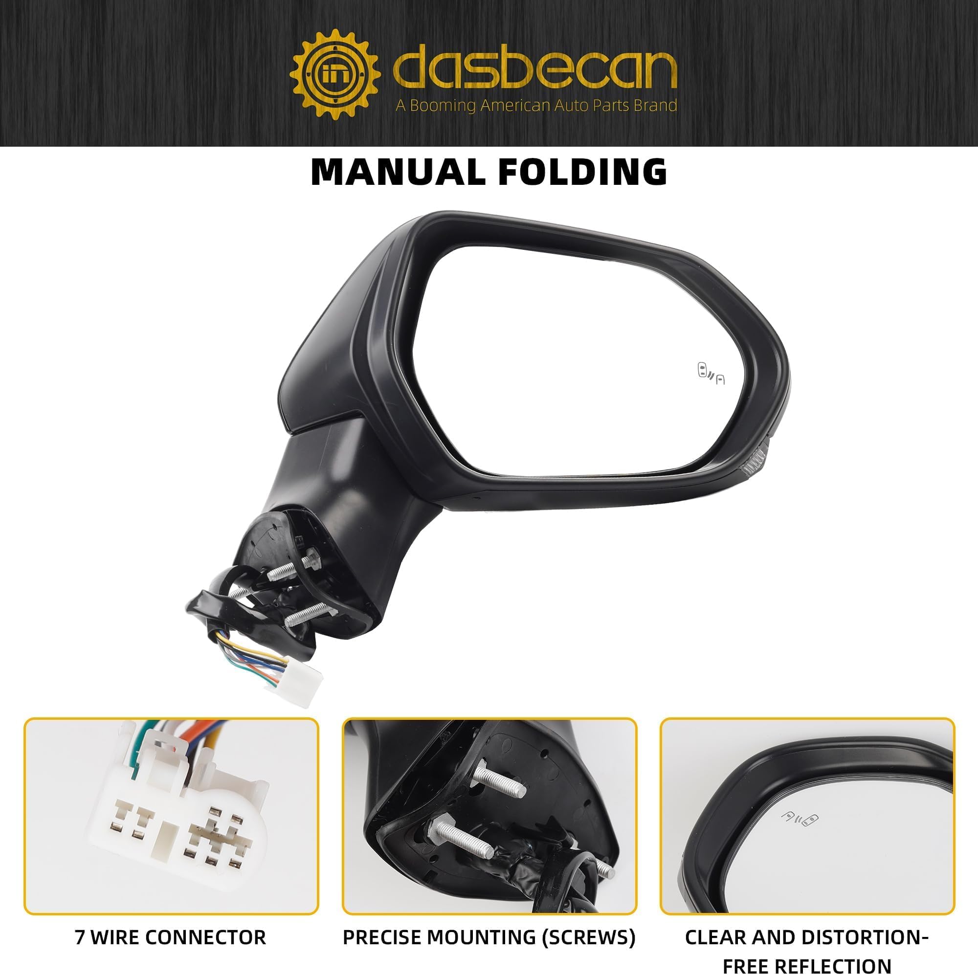 Specifications: Right, 7pins, Manual folding, Power Adjustment Glass, Heated, Blind Spot Detection, In-housing Signal Light.