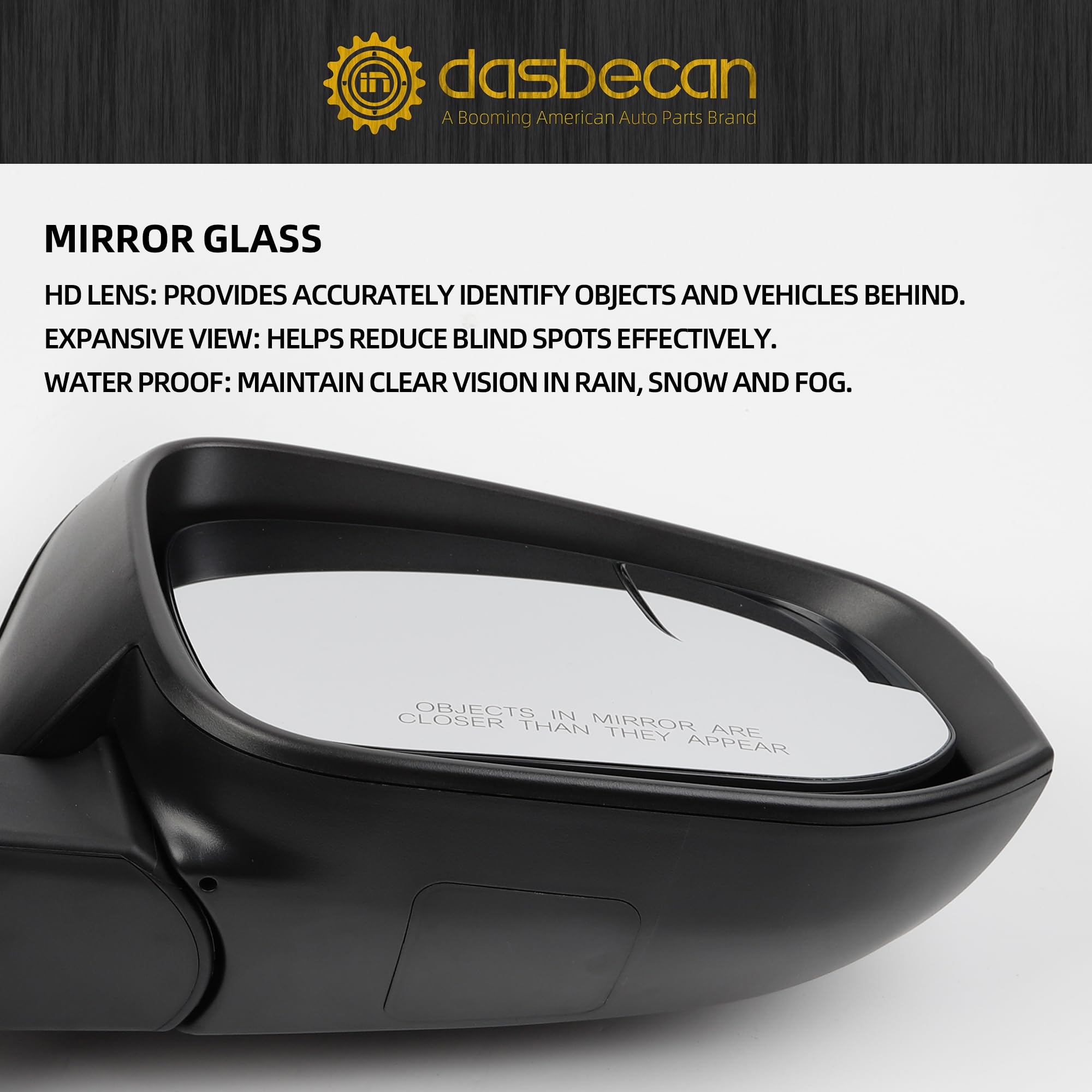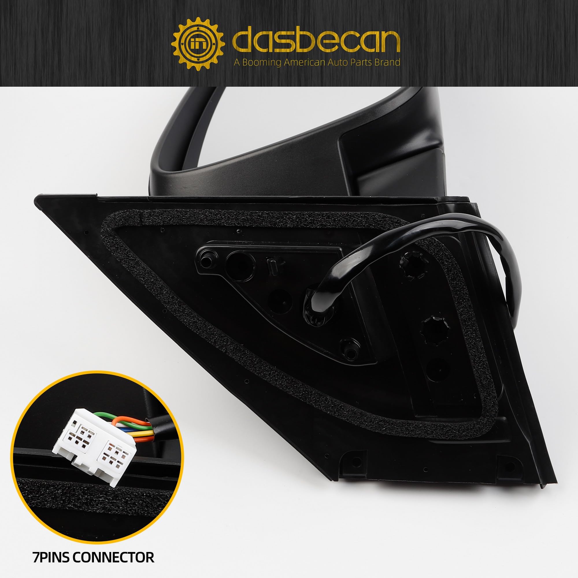 Parameter information: Color: black ( paint to match ); Interface type: 7wires/pins; Fuction: heated, power adjustment, manual fold , spotter mirror (dual glass), turn signal light; Position: passenger right side.