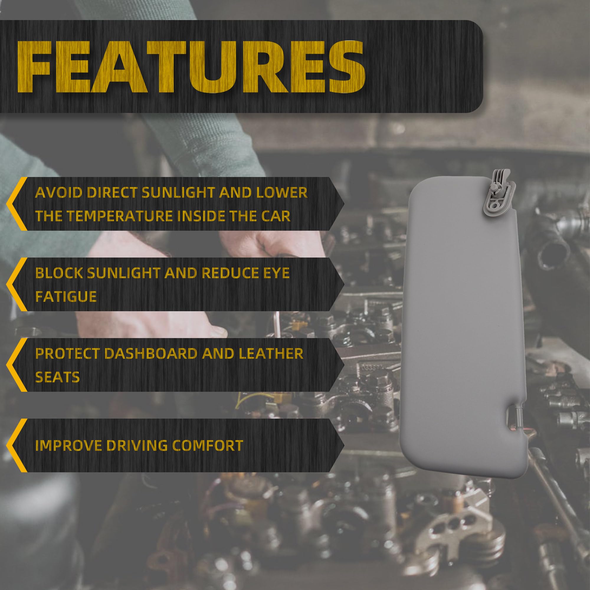 Product Features:Replace your old and damaged sun visor with ease.Reduce direct sunlight to the driver's eyes, enhancing driving safety and comfort.