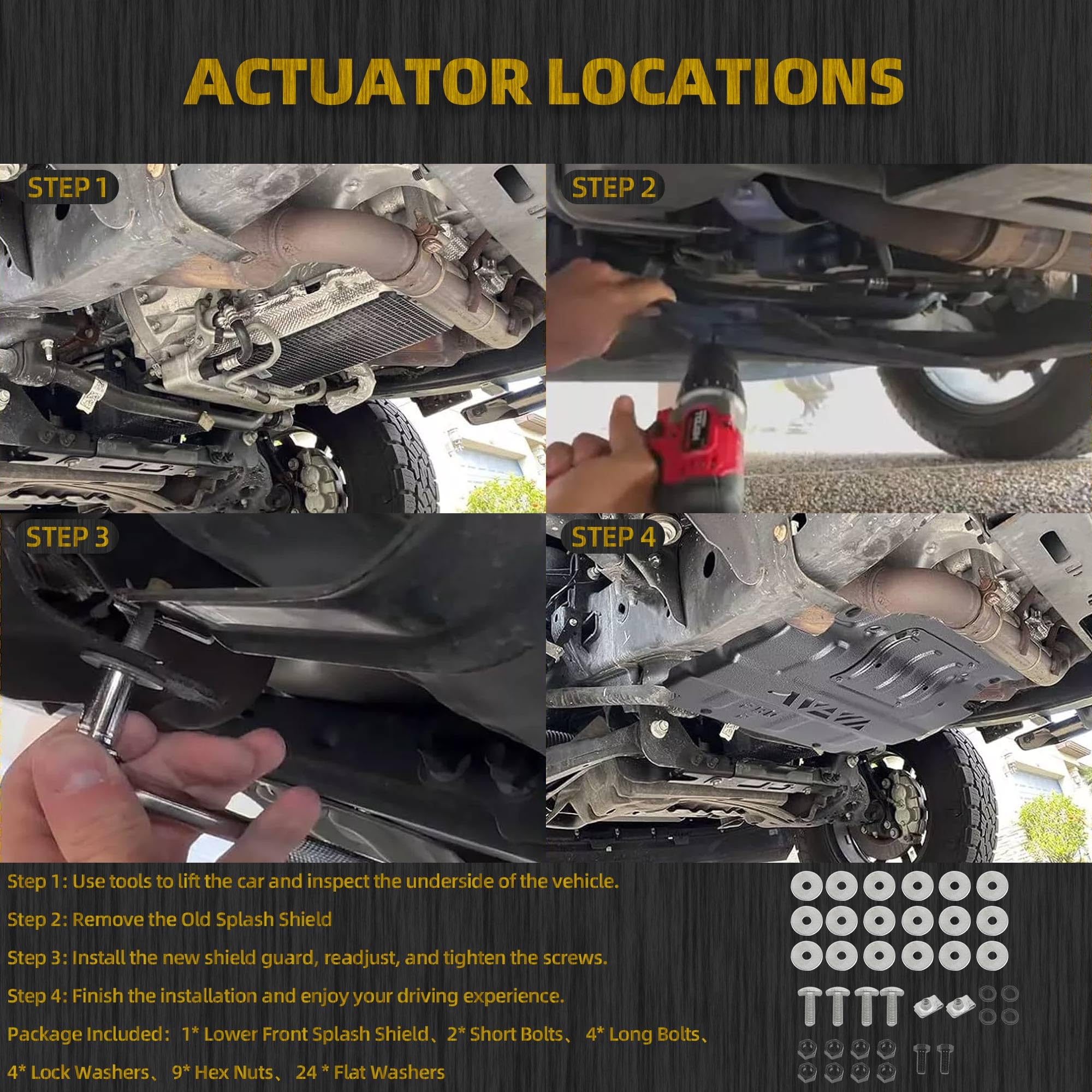 Package Included: 1* Lower Front Splash Shield , 2* Short Bolts , 4* Long Bolts , 4* Lock Washers , 9* Hex Nuts , 24 * Flat Washers.
