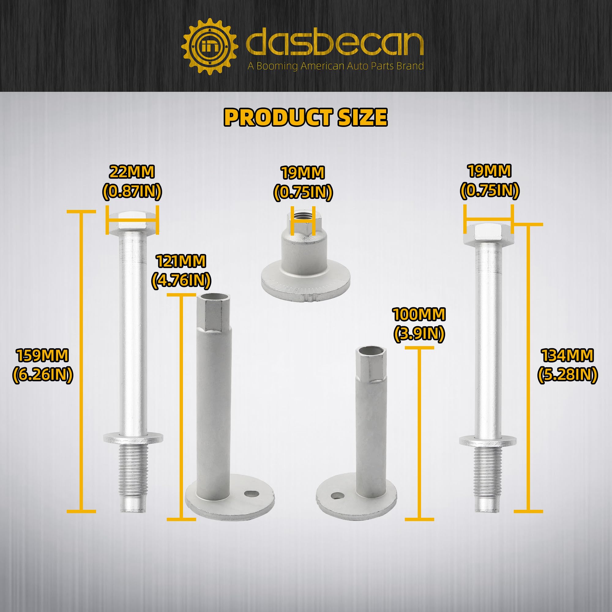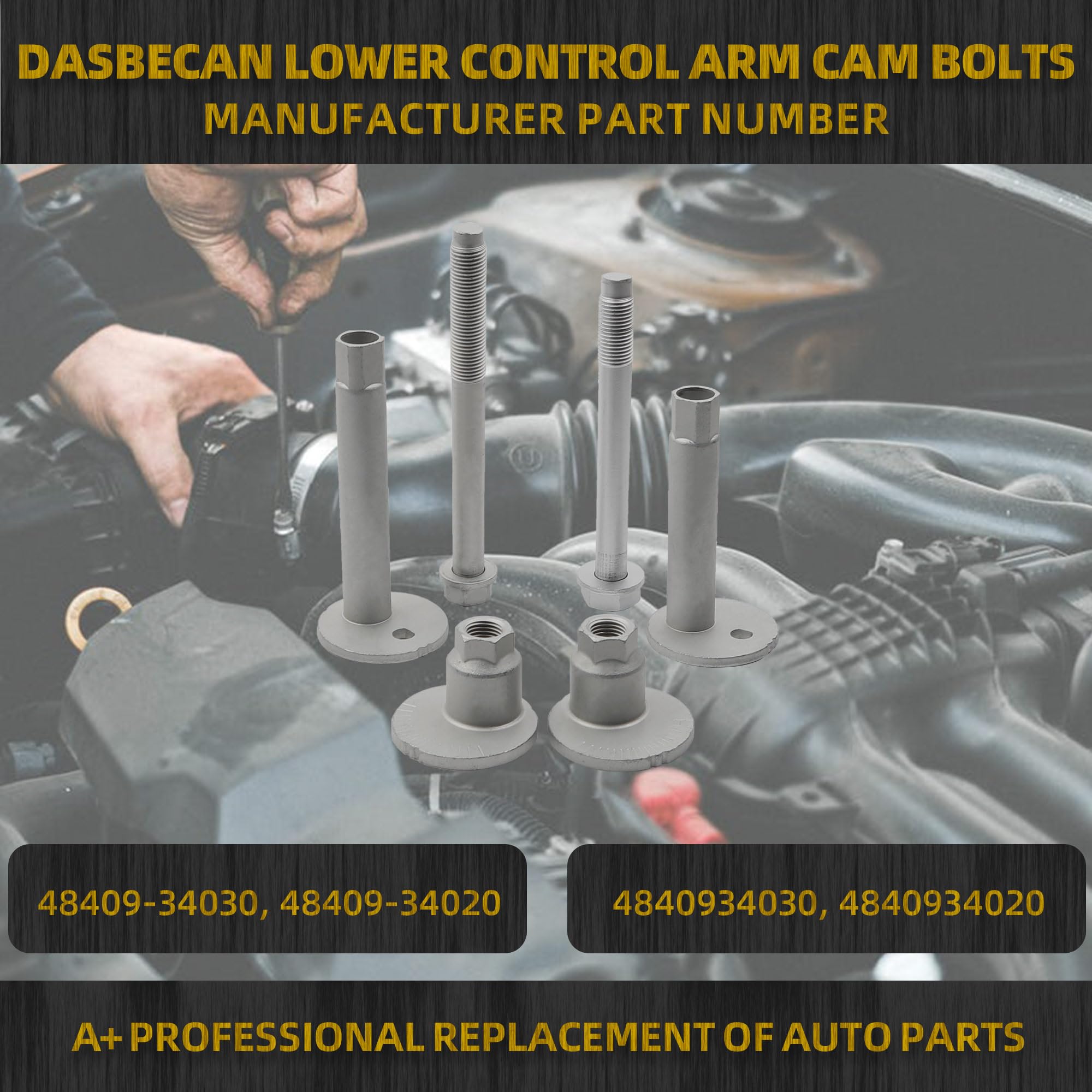 【Package Including】Control arm bolt kit includes 2 * washer bolts (different lengths), 2 * cam plate nuts (19mm) and 2 * cam adjusters .