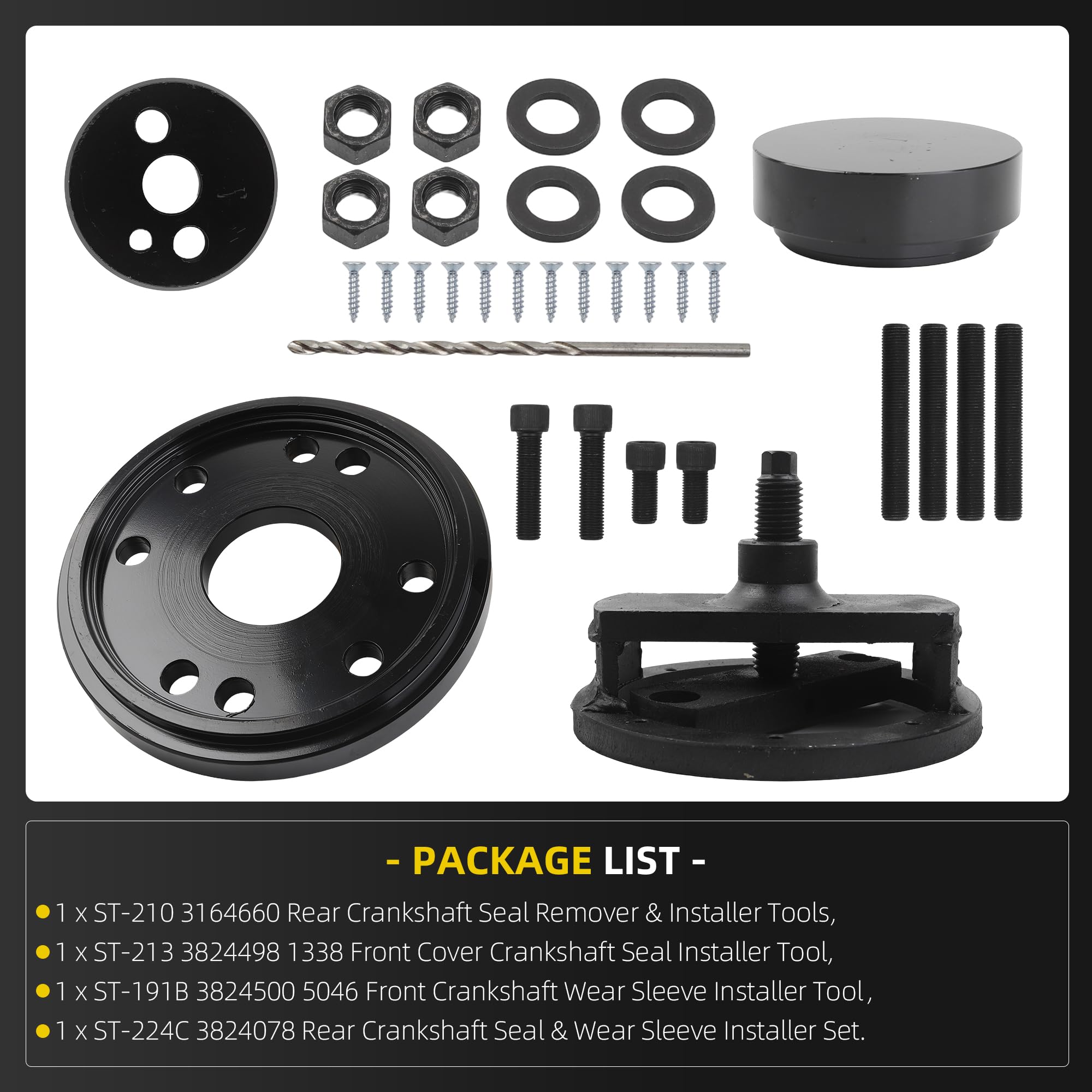 【Package list】1 x ST-210 3164660 Rear Crankshaft Seal Remover & Installer Tools; 1 x ST-213 3824498 1338 Front Cover Crankshaft Seal Installer Tool; 1 x ST-191B 3824500 5046 Front Crankshaft Wear Sleeve Installer Tool; 1 x ST-224C 3824078 Rear Crankshaft Seal & Wear Sleeve Installer Set.