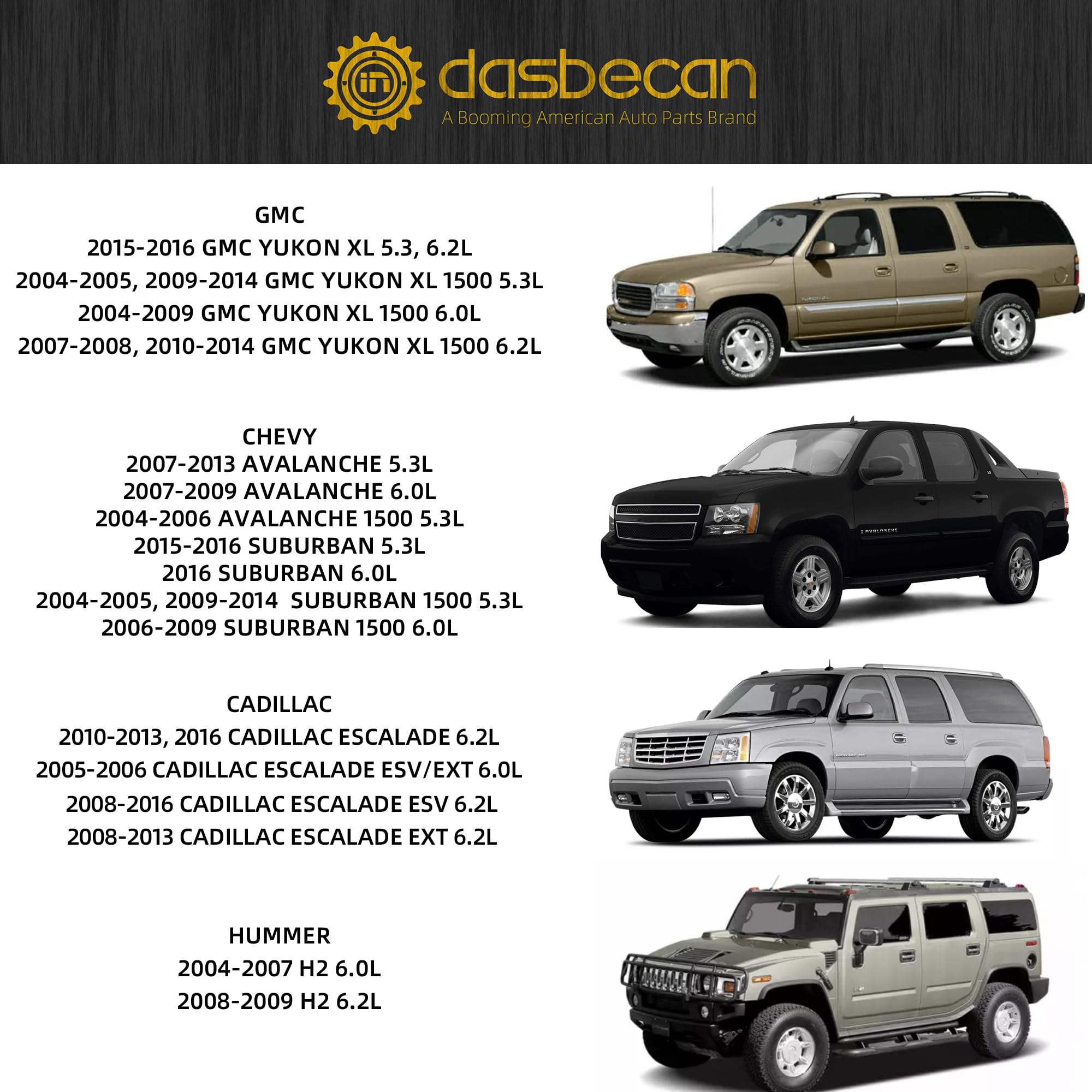 【Fitment】Compatible with GMC Models: 2015-2016 Yukon XL 5.3L 6.2L | 2004-2005, 2009-2014 Yukon XL 1500 5.3L | 2004-2009 Yukon XL 1500 6.0L | 2007-2008, 2010-2014 Yukon XL 1500 6.2L; Compatible with Chevy Models: 2007-2013 Avalanche 5.3L | 2007-2009 Avalanche 6.0L | 2004-2006 Avalanche 1500 5.3L | 2015-2016 Suburban 5.3L | 2016 Suburban 6.0L | 2004-2005, 2009-2014 Suburban 1500 5.3L | 2006-2009 Suburban 1500 6.0L; Compatible with Cadillac Models: 2010-2013, 2016 Escalade 6.2L | 2005-2006 Escalade ESV EXT 6.0L | 2008-2016 Escalade ESV 6.2L | 2008-2013 Escalade EXT 6.2L; Compatible with Hummer Models: 2004-2007 H2 6.0L | 2008-2009 H2 6.2L.