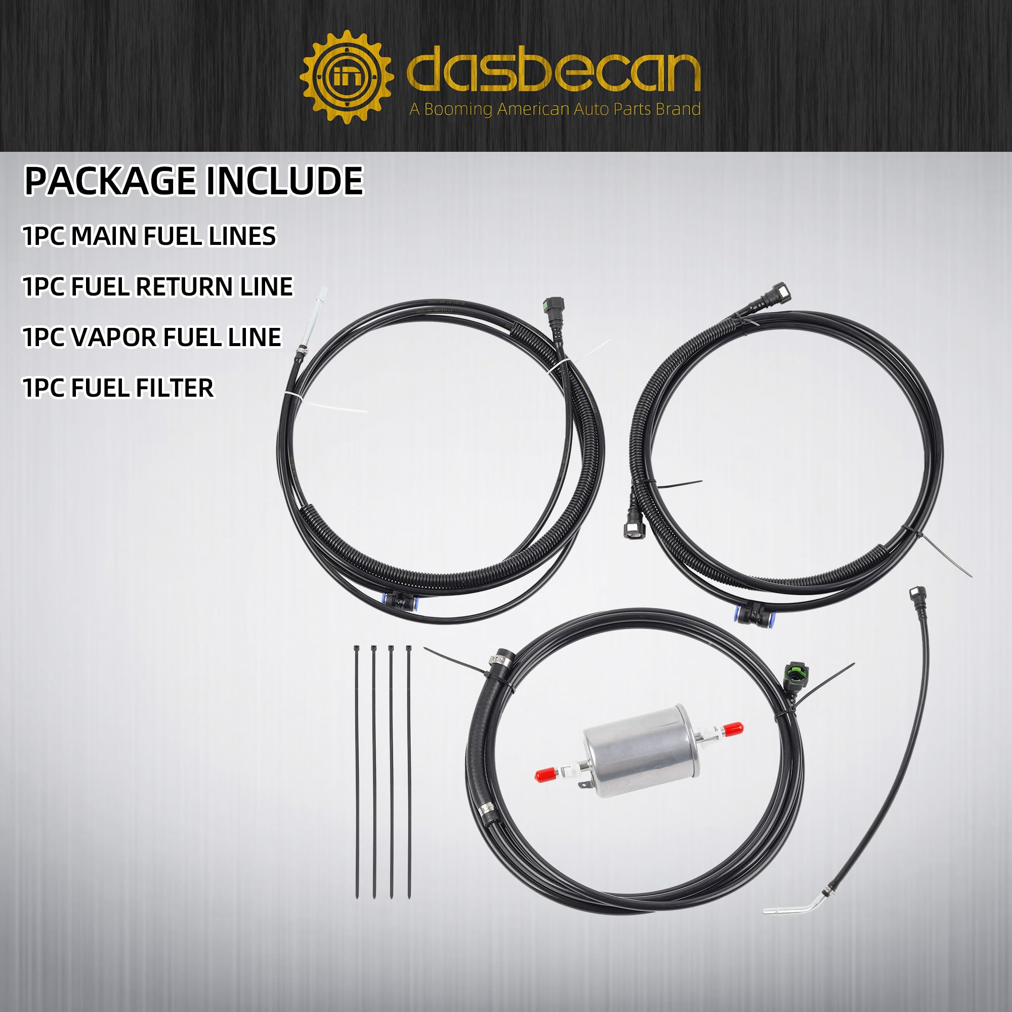 【Packaging list】1 Set x Nylon Fuel Lines: 1 Pcs Main Fuel Line: Fuel Filter To Fuel Tank, 1 Pcs Main Fuel Line: Engine To Fuel Filter, 1 Pcs Fuel Return Line, 1 Pcs Vapor Fuel Line, 1 Pcs Fuel Filter