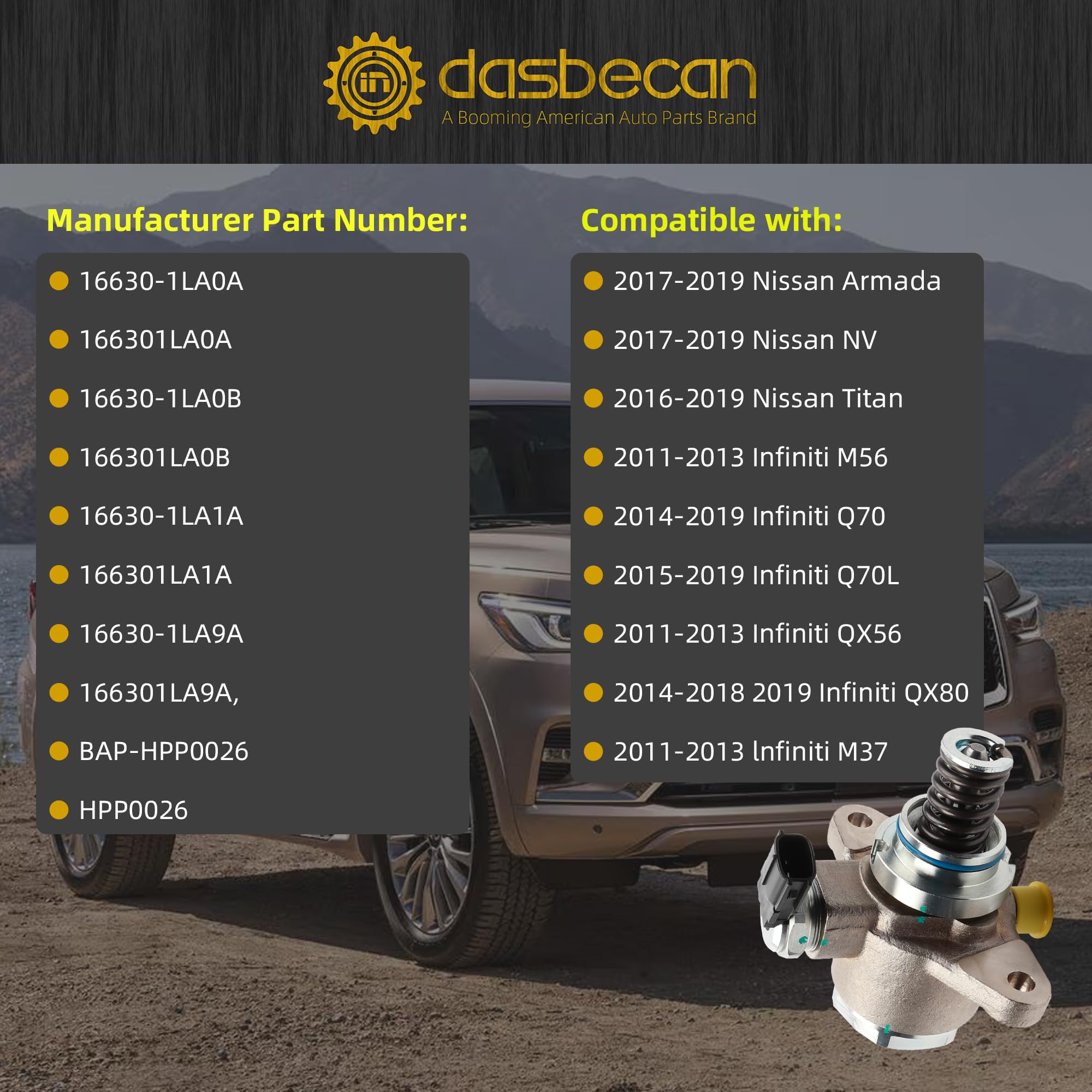Broad Compatibility: This High Pressure Fuel Pump is specifically designed to fit a wide range of vehicles, including Infiniti models such as M37 (2011-2013), M56 (2011-2013), Q70 (2014-2019), Q70L (2015-2019), QX56 (2011-2013), and QX80 (2014-2019). It also fits Nissan Armada, NV, and Titan (2016-2019) with a 5.6L engine, ensuring a perfect match for your vehicle.