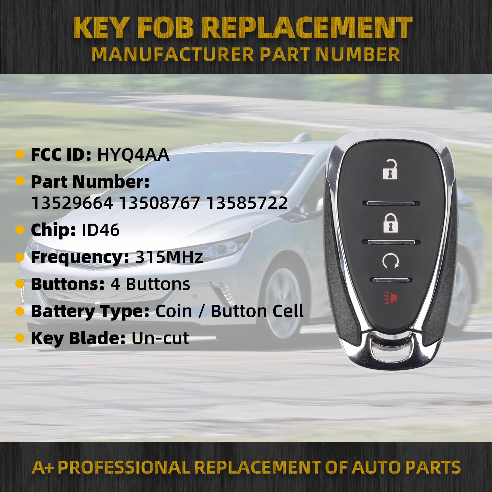 Replaces Part Number: FCC ID HYQ4AA, Part Number 13529664,13508767,13585722, Frequency: 315Mhz, Chip: ID46. This keyless entry remote has 4 button functions: Lock, Unlock, Remote Start, Panic Alarm.