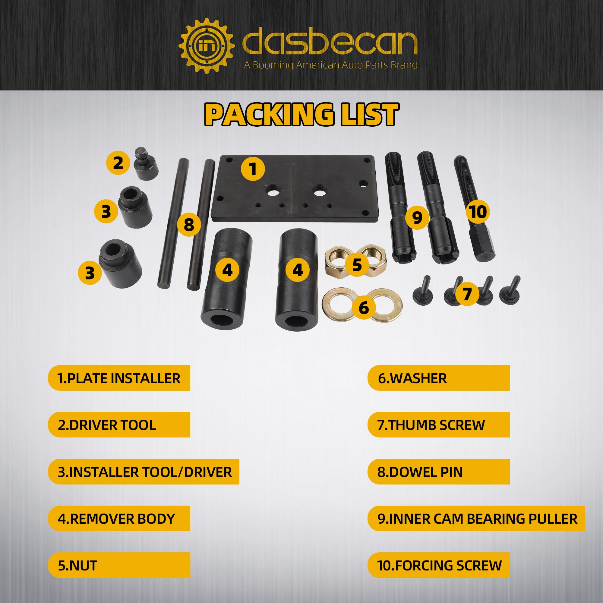 Packing list: 1 x Black Steel 8mm Cam Bearing Plate; 1 x Installer Tool; 1 x Puller Tool; 4 x Thumb Screws; 1 x Installation Instructions
