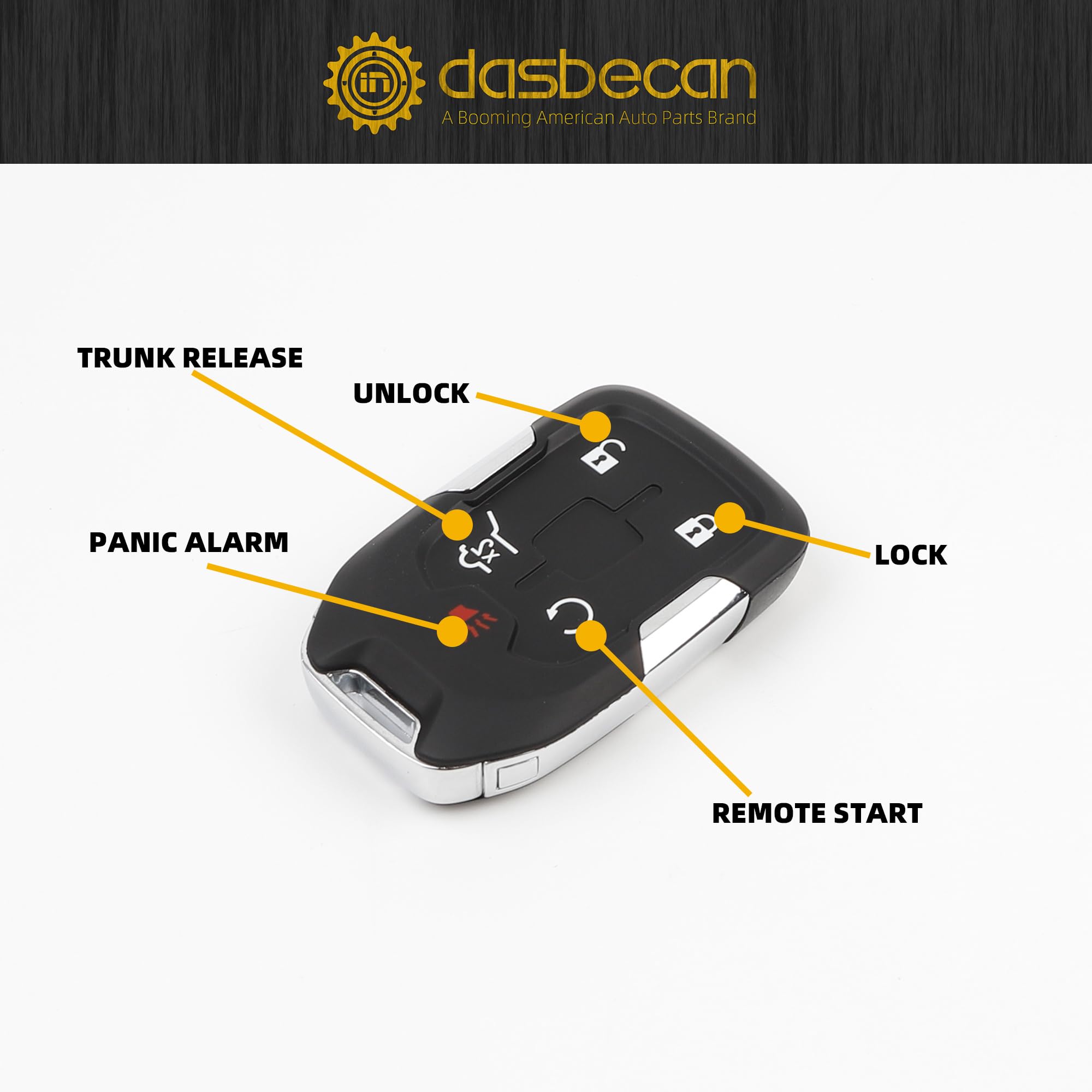5-Button Design: This remote control has 5 buttons, which are used for locking the car, opening the doors, arming/disarming the alarm,releassing the trunk, and remotely starting the vehicle