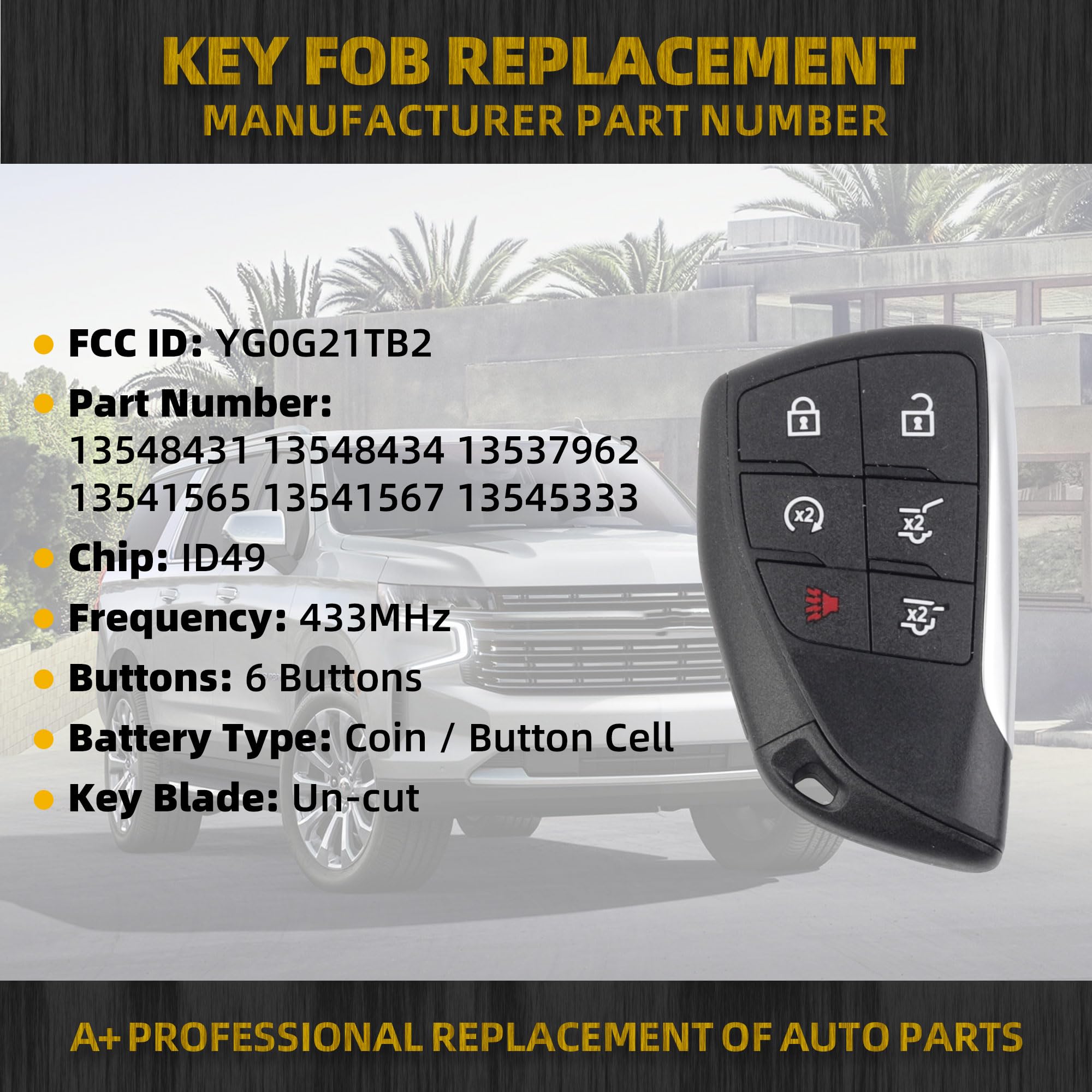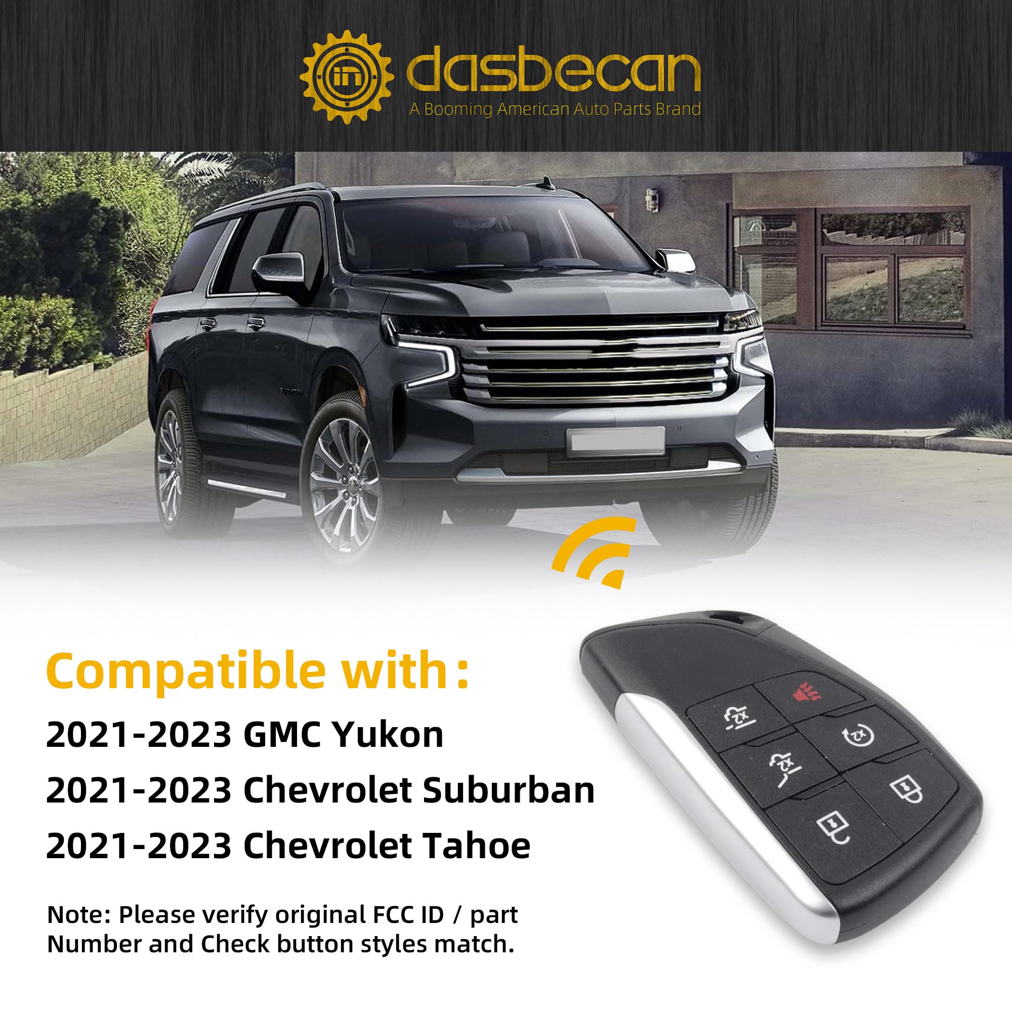 Fitment: This key fob replacement fits for 2021-2023 GMC Yukon, 2021-2023 Chevrolet Suburban, 2021-2023 Chevrolet Tahoe. Please check against your vehicle model before purchasing.