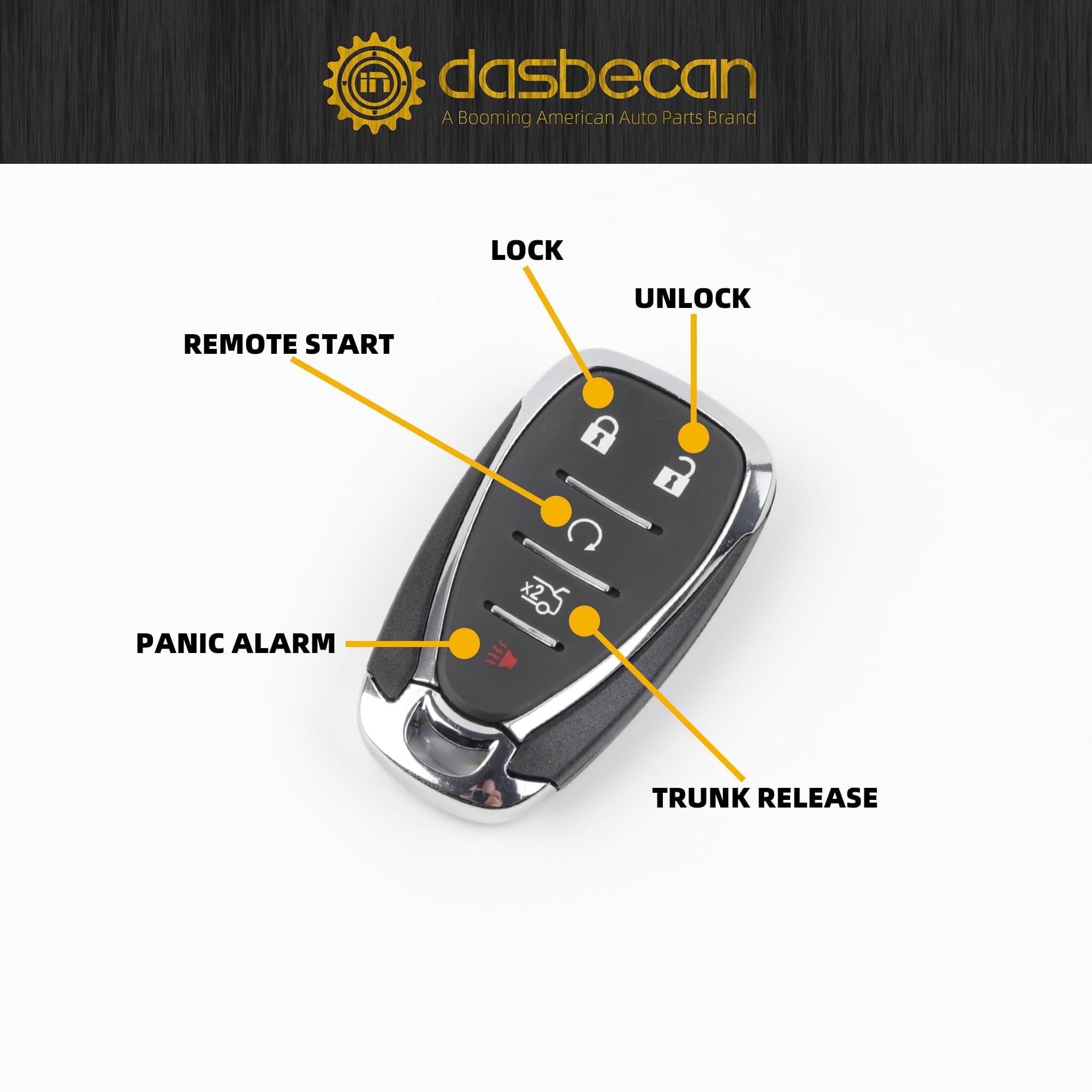 Feature: Our smart key fob comes with all electrionics, battery and uncut emergency insert key blade, and it doesn't come with logo or badge. This keyless entry remote has 5 button functions: Lock, Unlock, Remote Start, Trunk Release, Panic Alarm.