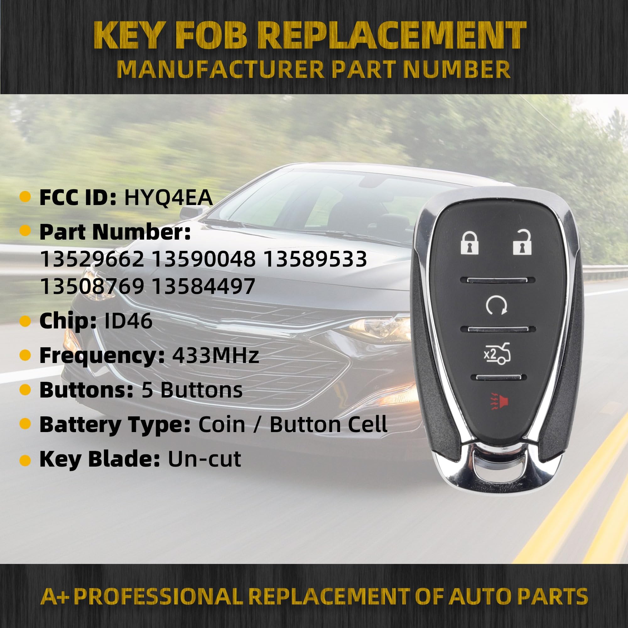 Replaces Part Number: FCC ID HYQ4EA, Part Number 13529662, 13590048, 13589533, 13508769, 13584497, Frequency: 433Mhz, Chip: ID46.