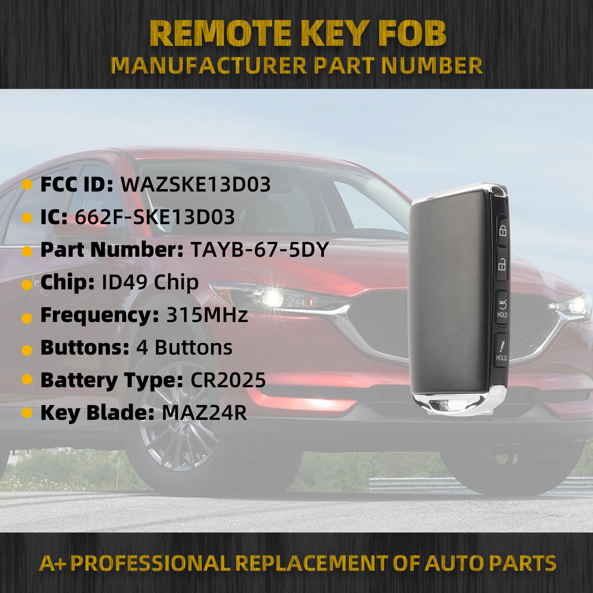 Parameter: Part Number: TAYA-67-5DYB; FCC ID: WAZSKE13D03; IC: 662F-SKE13D03; Frequency: 315 MHz; Chip: ID49 Chip; Battery Type: CR2025; Key Blade: MAZ24R