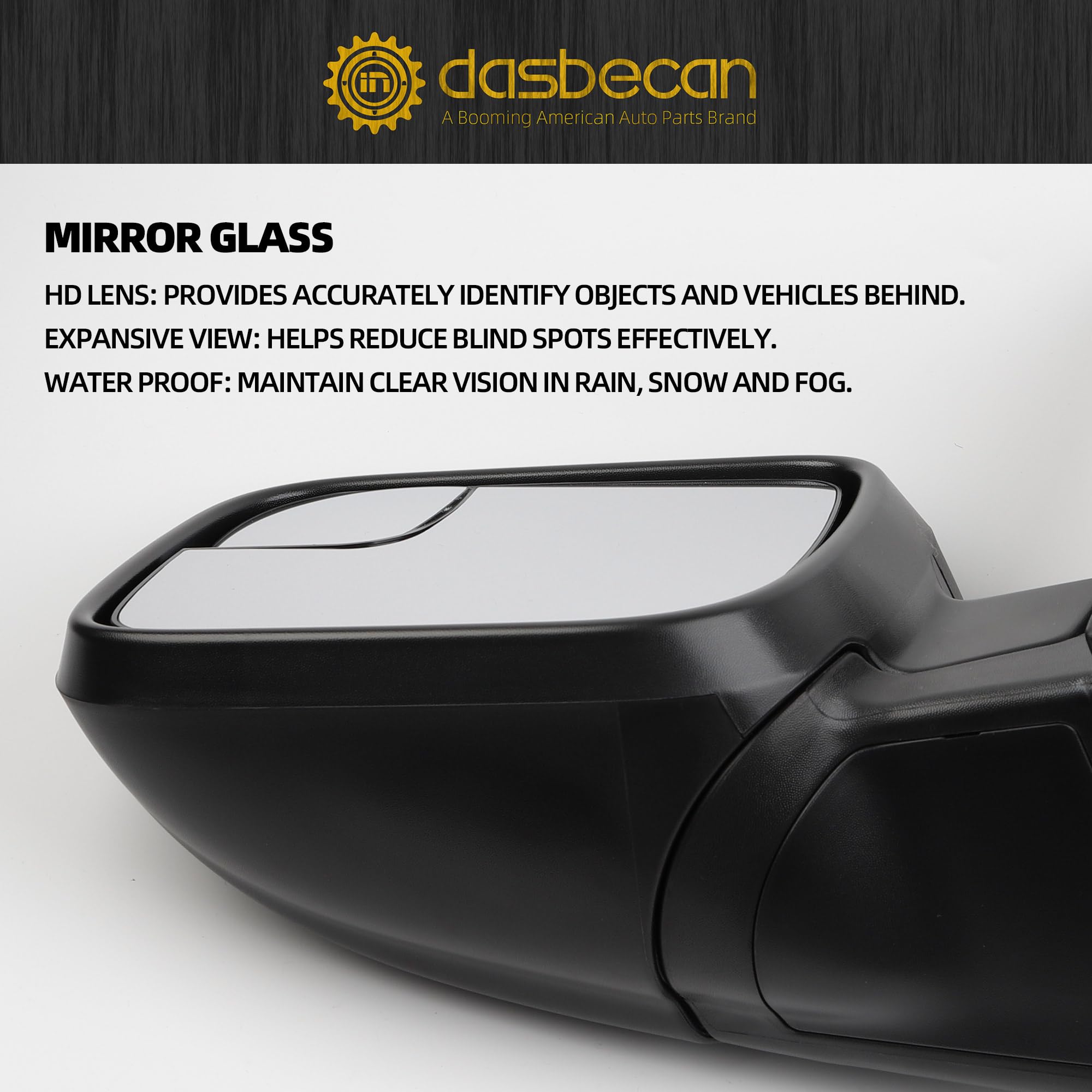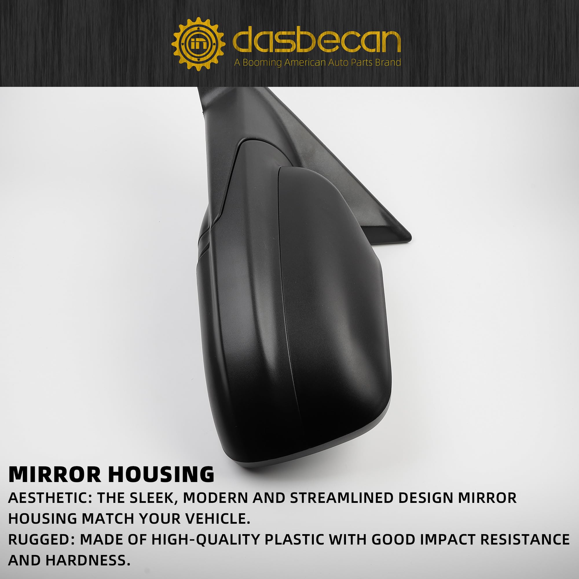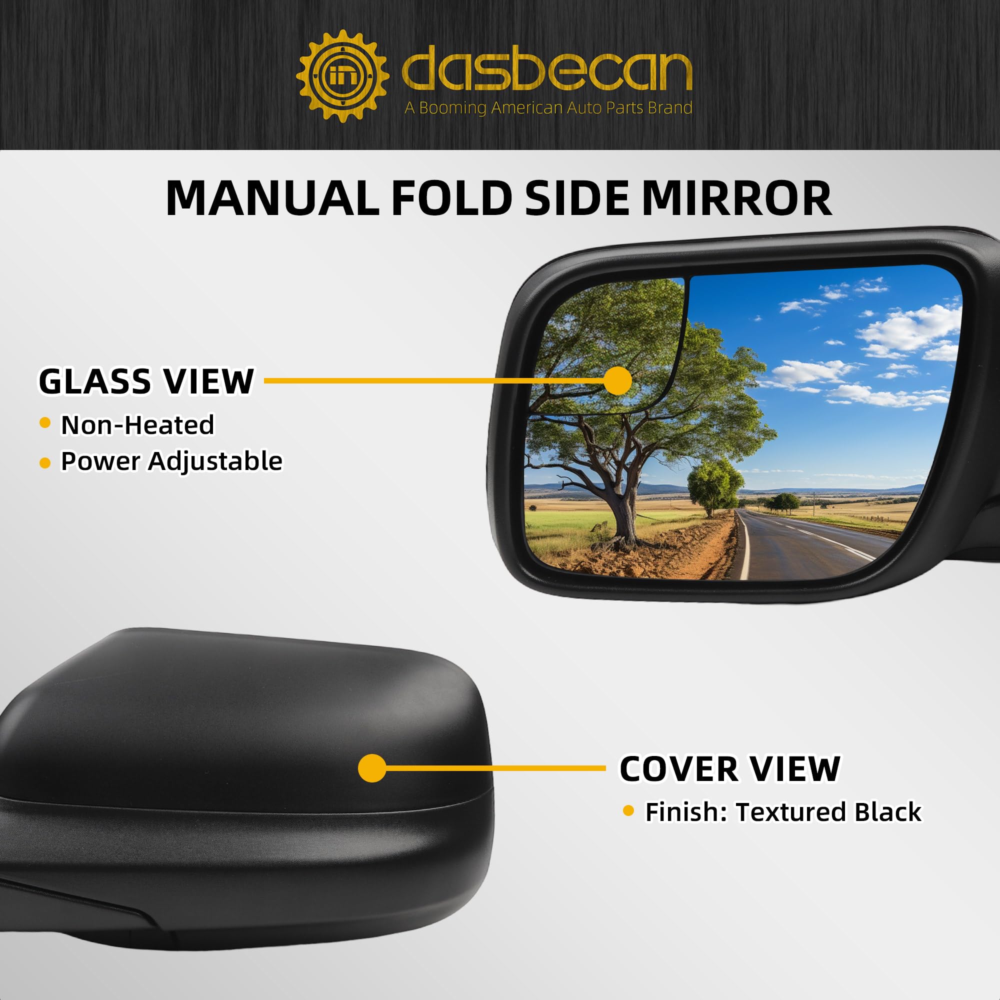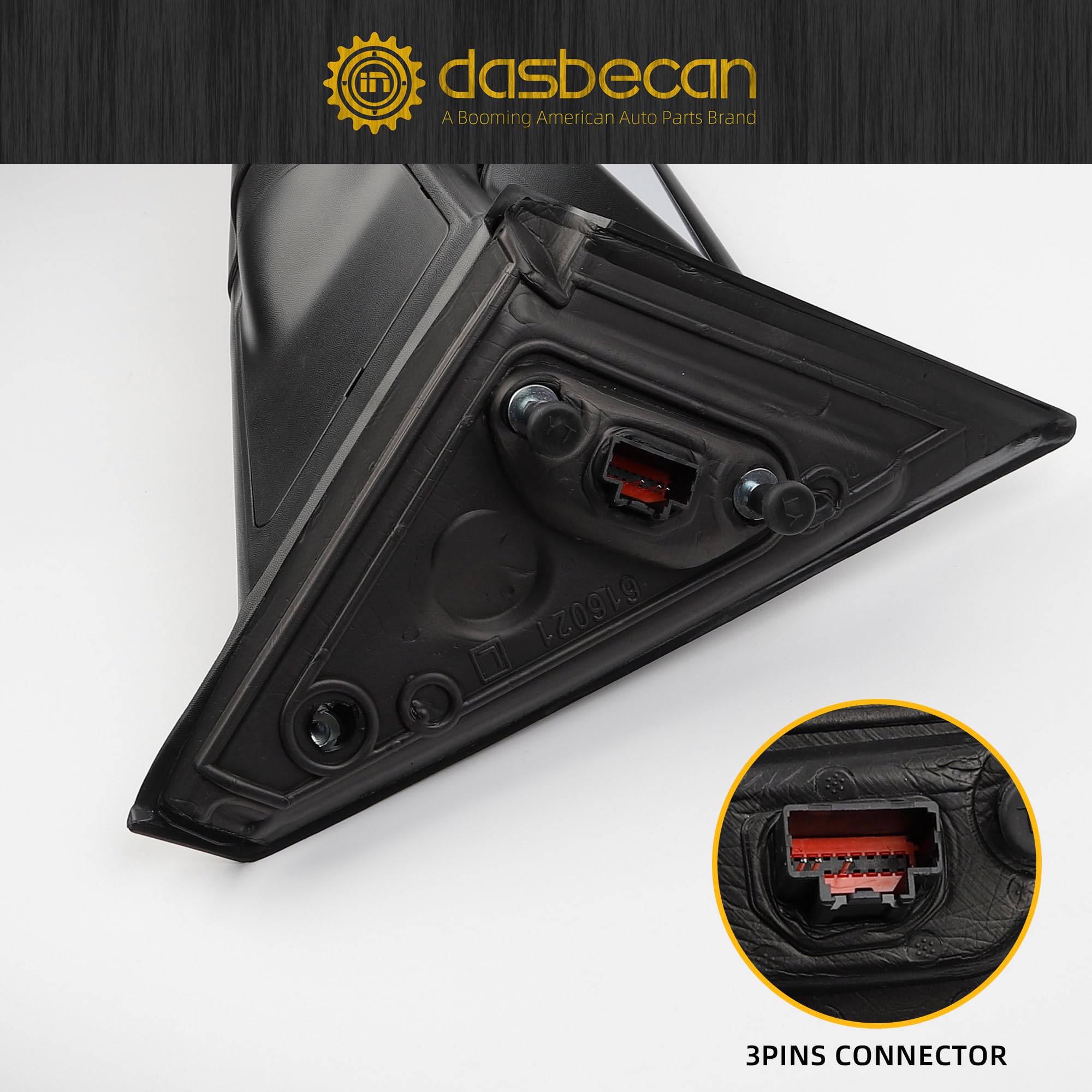 Specifications: Left Driver Side Exterior Mirror, Power Glass Adjustment, Manual Folding, Paint to Match Black Cover, 3 Pins Connector.