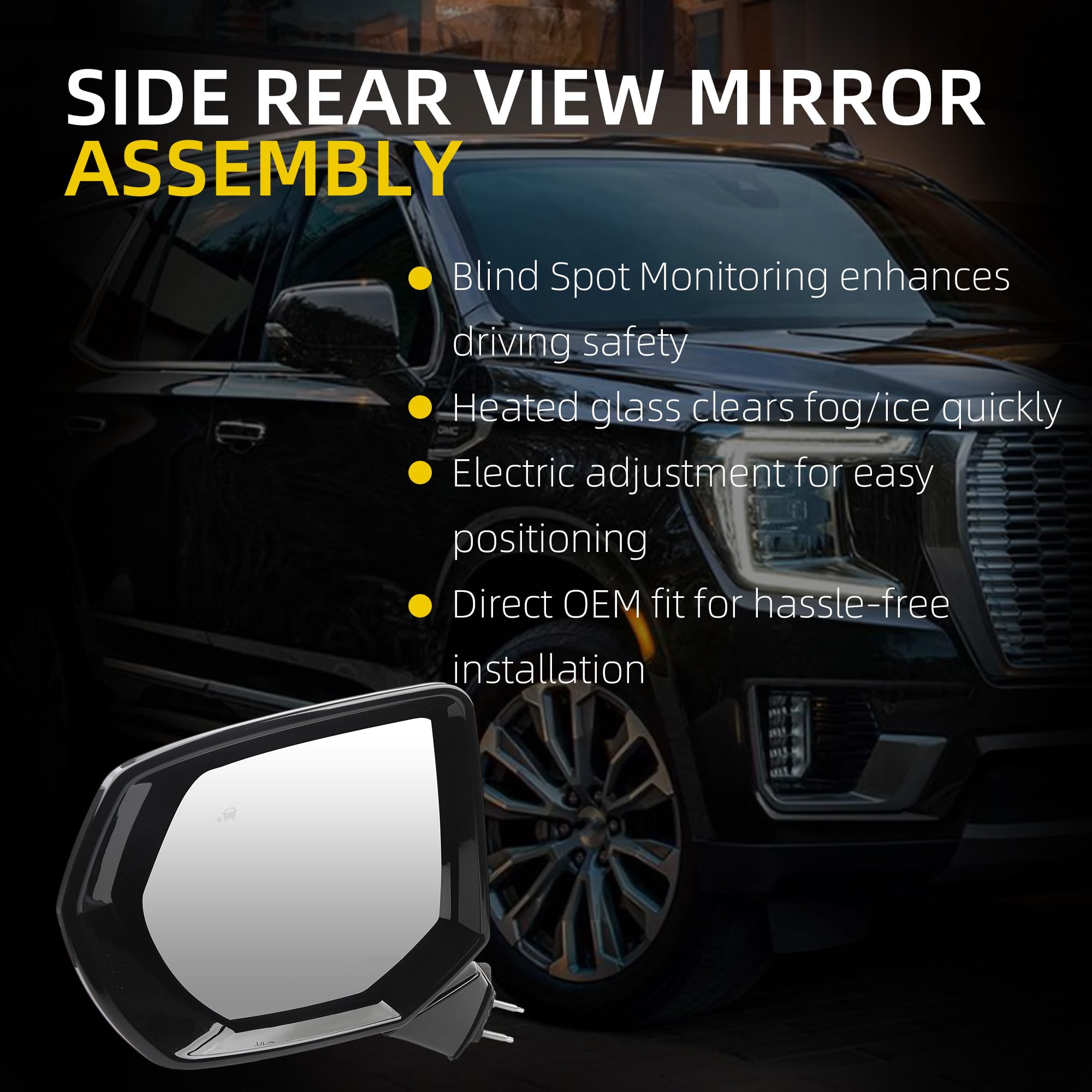 Fitment: This outside rear view mirror is compatible with Chevrolet Suburban/Tahoe 2021-2024, GMC Yukon/Yukon XL 2021-2024.