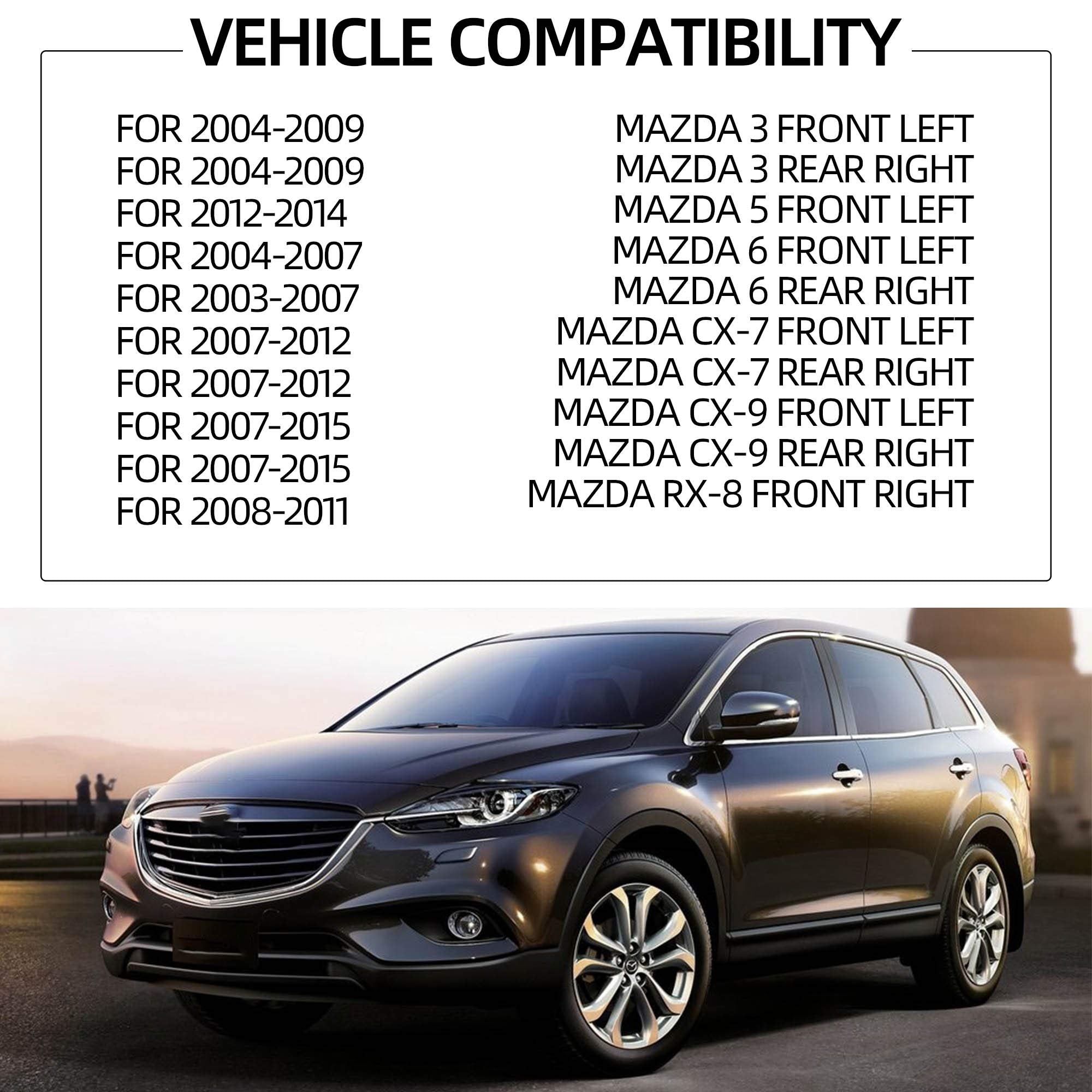 【Fitment】2004-2009 Mazda 3 Front Right & Rear Left, 2003-2007 Mazda 6 Front Right & Rear Left 2006-2015 Mazda 5 Front & Rear Right, 2007-2012 Mazda CX-7 Front Right & Rear Left, 2007-2015 Mazda CX-9 Front & Rear Right, 2008-2011 Mazda RX-8 Front Left