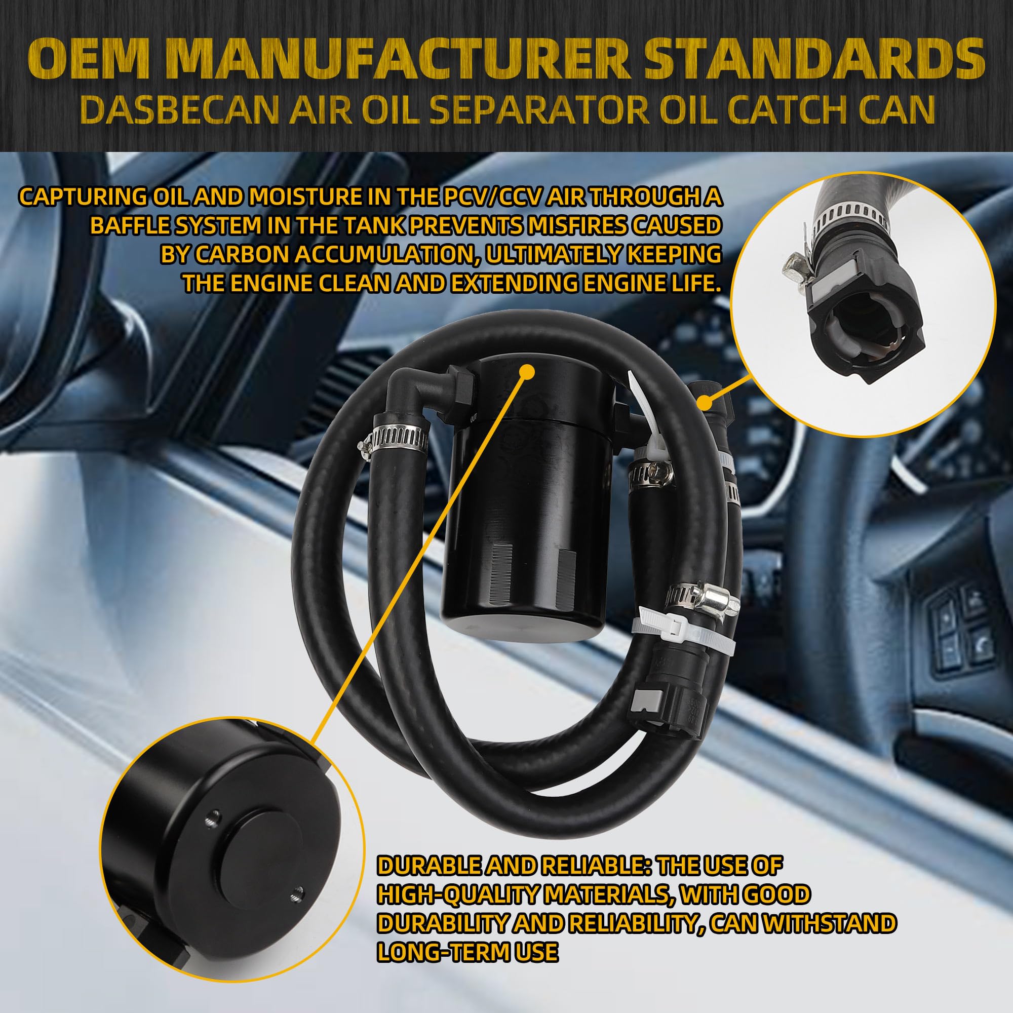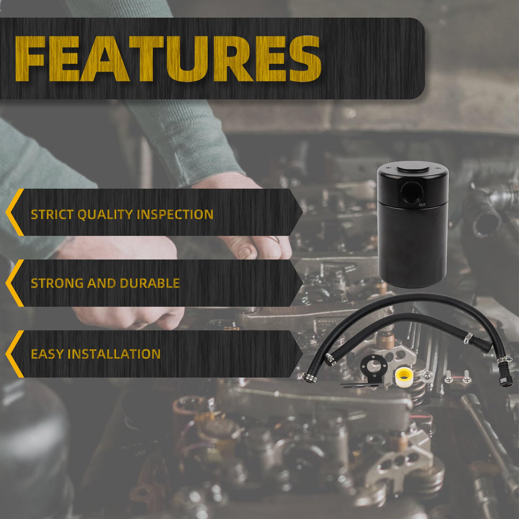 【Function】Install the oil catch can on the PCV side of your engine for efficient oil separation. The fine mesh aluminum filter captures fine oil vapor, helping to extend engine life and keep it running smoothly and cleanly.