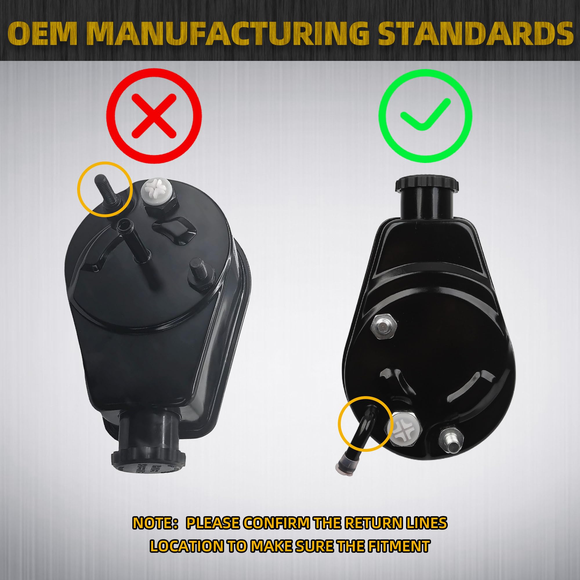 Please compare you old power steering pump to ensure the return hose comes out the bottom of the reservoir as shown.