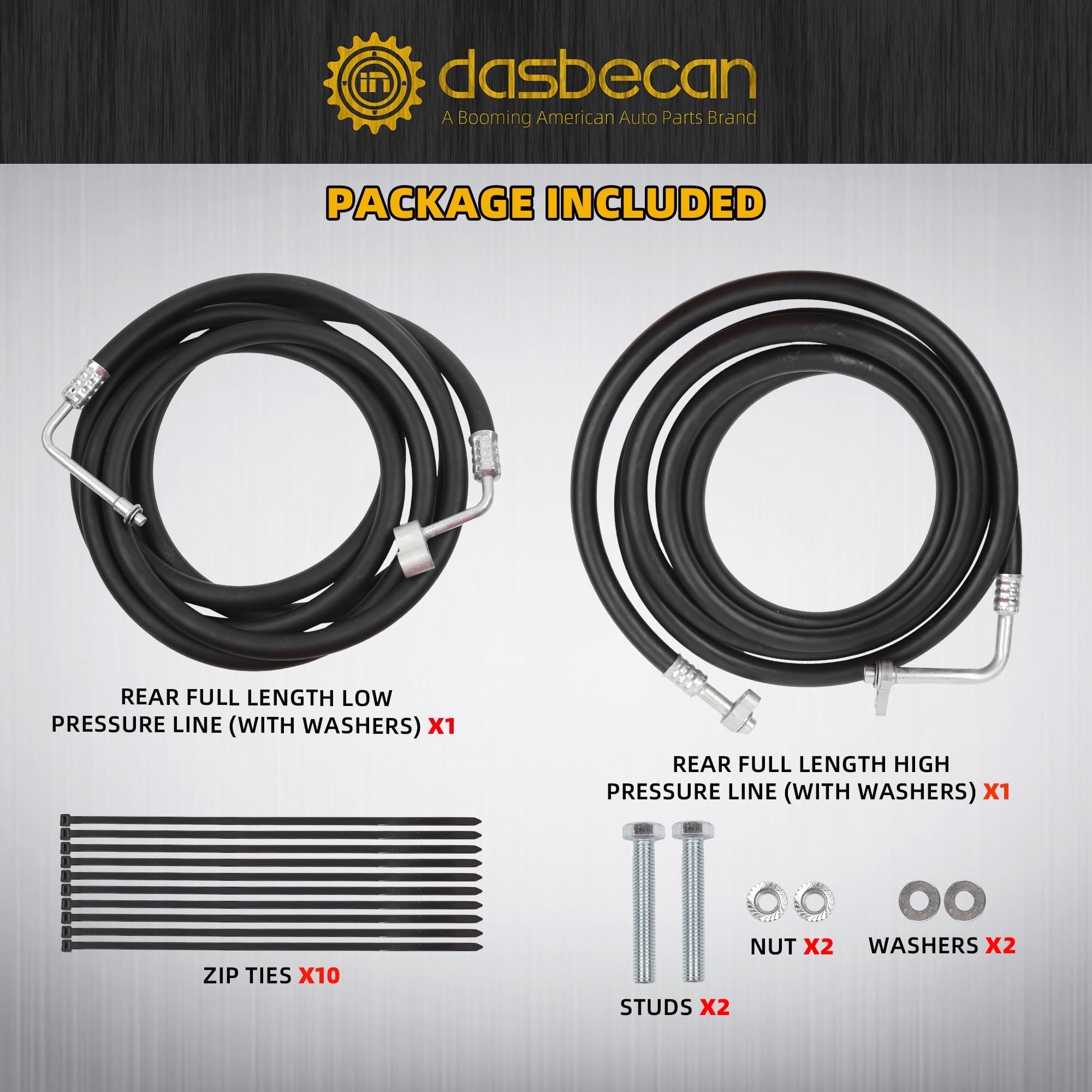 【Package Including】1* Rear full length low pressure line (with washers) 1* Rear full length high pressure line (with washers) 10* Zip Ties 2* studs 2* Nut 2* washers