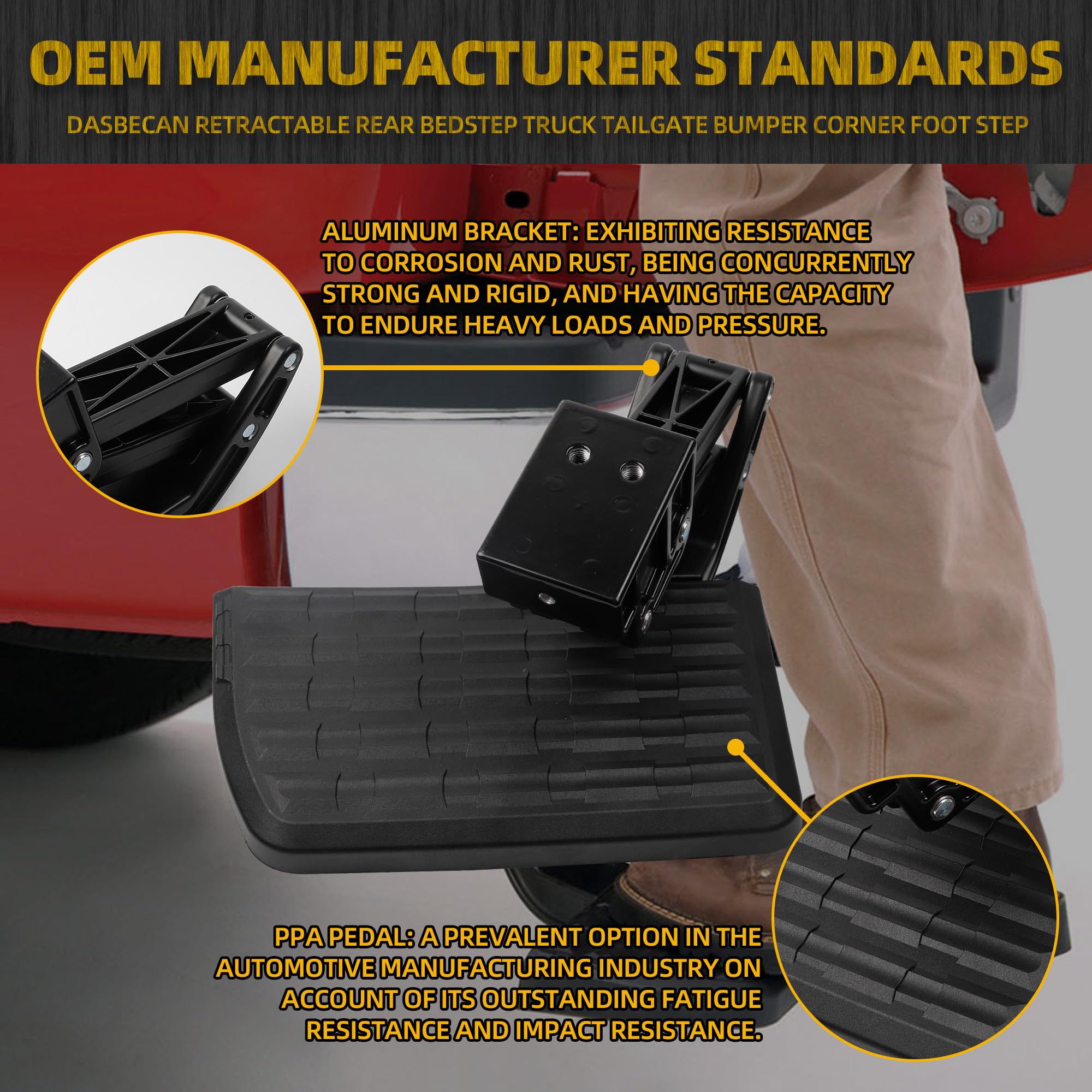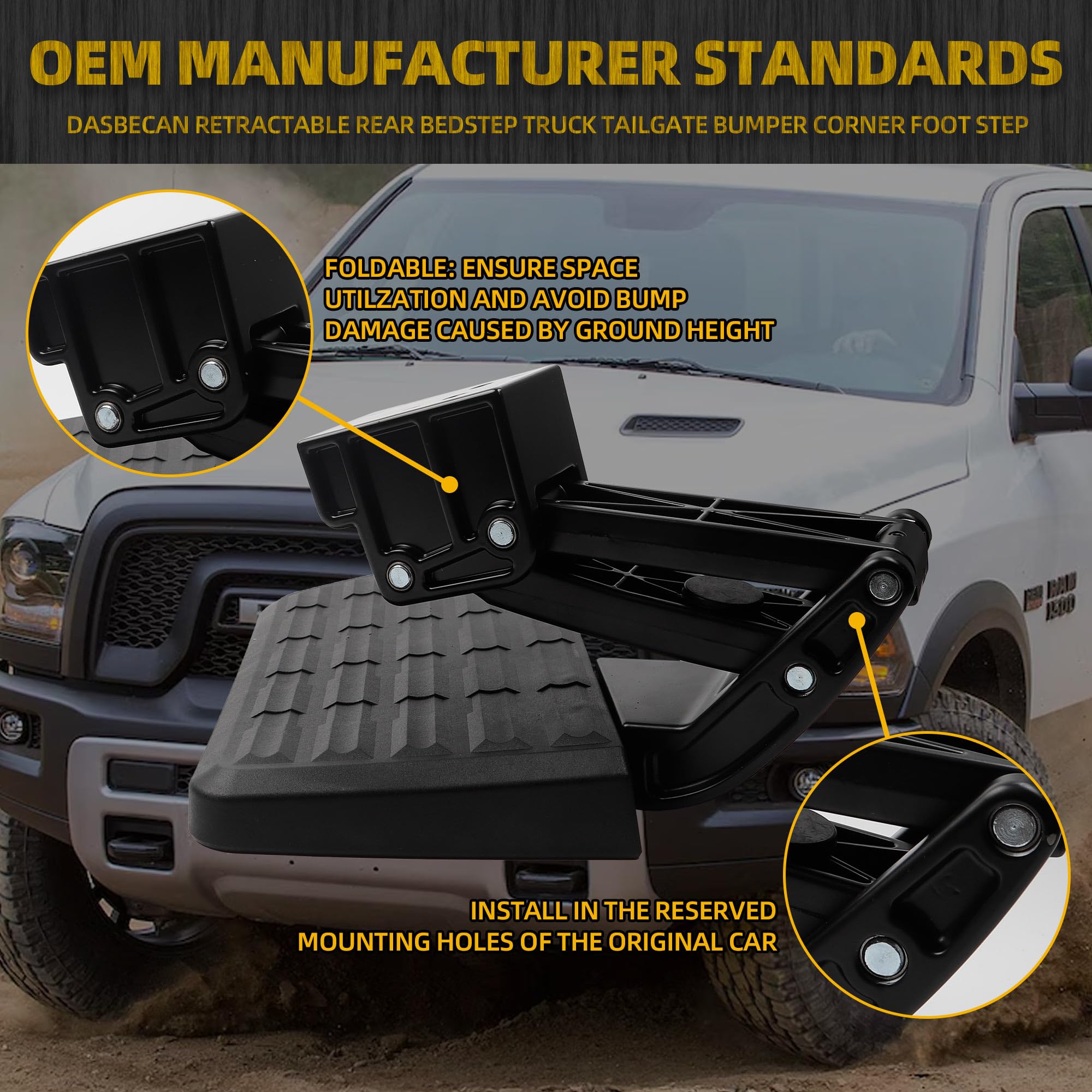 【Product Introduction】The truck chassis is high off the ground, making it difficult and dangerous to get up and down. Tailgate pedals can solve this problem. The heavy-duty rear pedal meets OEM standards and has been factory tested to perfectly match the original car and can be installed directly.